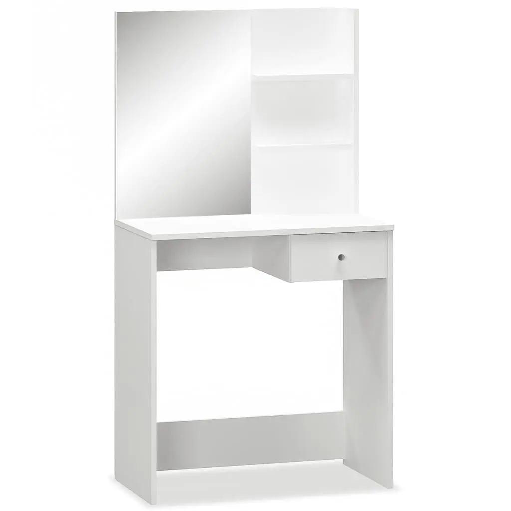 This makeup table with a modern and stylish design will make a great addition to your bedroom decor. The dressing table is made of chipboard with PVC edges and is stable and durable. Thanks to its spacious drawer and shelving system, you will find sufficient storage space for all your beauty products and anything else you’d like to keep within reach so can reduce clutter in your bedroom. Assembly is easy as a kit with everything you need is included.