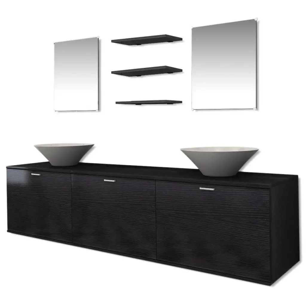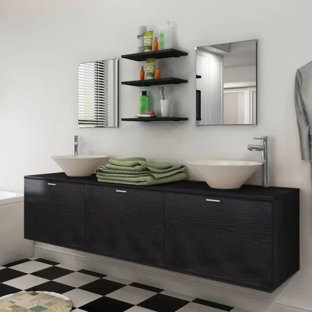 This complete set, consisting of 1 wall-mounted basin cabinet, 2 mirrors, 3 shelves and 2 basins, will make a great addition to your bathroom, optimising your space without compromising on style. The basin cabinet with three drop-down doors provides ample space to store your toiletries, beauty products and various kinds of smaller items. Combs, cosmetics, toothbrushes and toothpaste can be organised on the shelves conveniently within reach. Made of high-quality chipboard, this vanity unit is highly sturdy and durable. The two basins are made of high-quality ceramic, which makes them scratchproof, corrosion resistant and easy to clean. They are suitable to be mounted above the countertop. Assembly is really easy. Delivery also includes two pop-up drain plugs and mounting accessories. Please note: the faucets are not included in delivery; the holes for the faucets are not predrilled.
