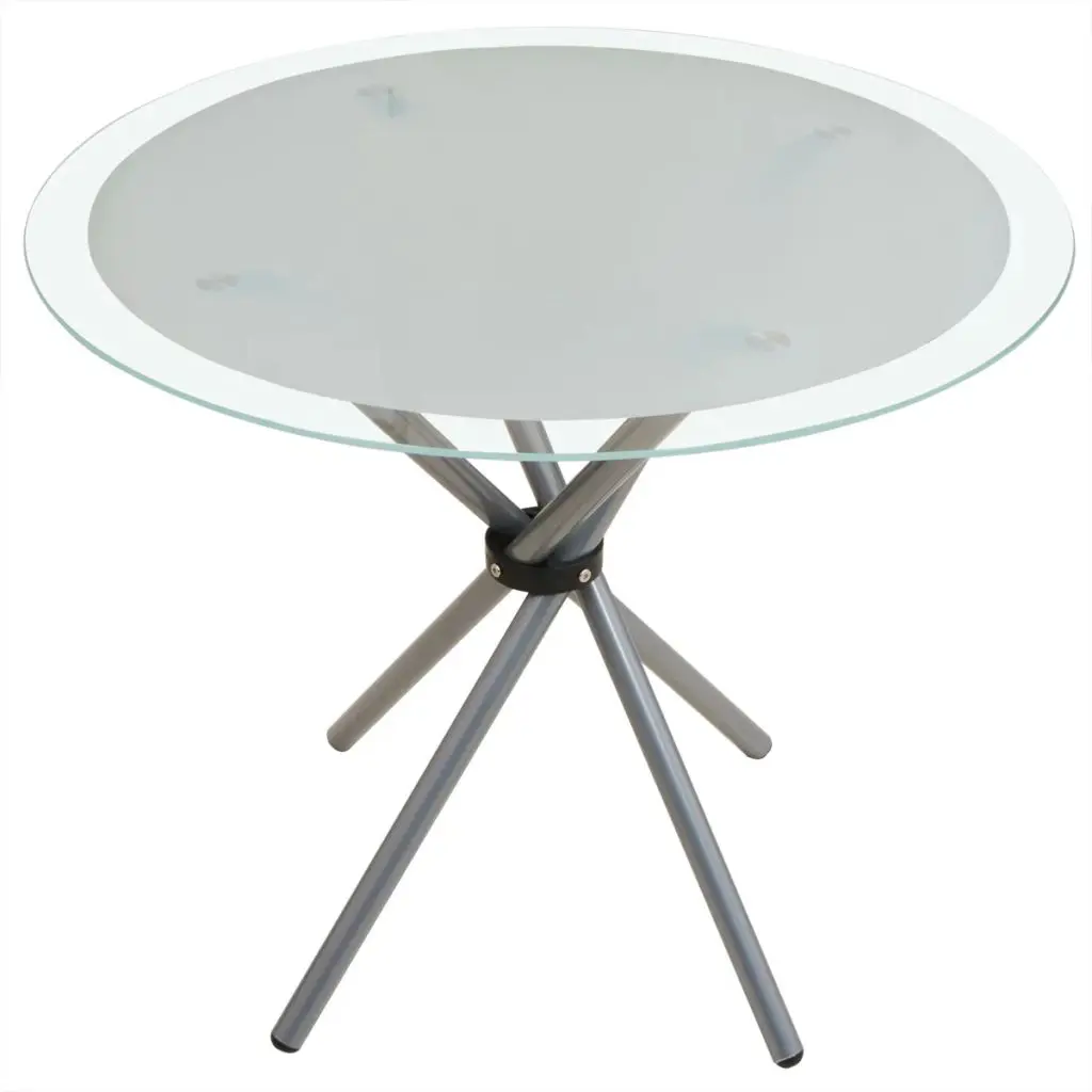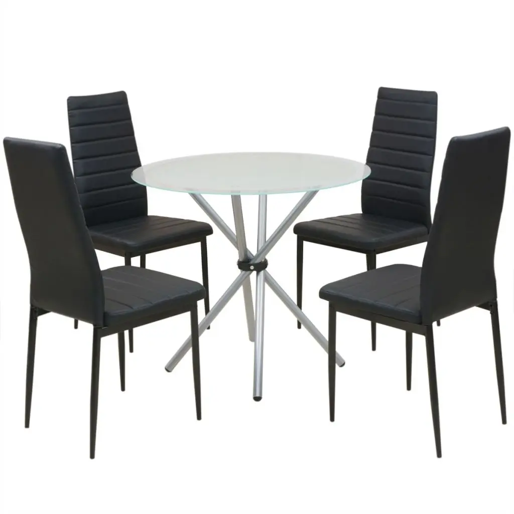 This contemporary dining table set, consisting of 5 pieces, has a sleek, modern design and is perfect for those who are looking to add a touch of style to their interior. The steel legs provide plenty of support for the table whilst the glass top, which has a printing table top with transparent table edge, is made from high-strength tempered glass and is easy to clean. Thanks to the thickly padded seat and backrest, these dining chairs offer the utmost seating comfort. The solid powder-coated steel frames are very stable and durable. Assembly is very easy. Delivery includes 1 table and 4 chairs.