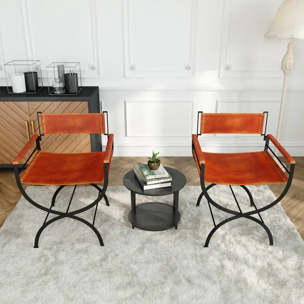 This 2-piece soft and comfortable genuine leather chair set has a rustic design with a touch of the industrial style that’s all the rage right now. It will look great not only in your living room or dining room at home, but also in your outdoor living space. The genuine leather seat, backrest and armrests are soft to the touch and very comfortable, while the powder-coated steel frame makes the chair extremely durable. The beautiful lines of the legs add to the chair’s unique and vintage look. Thanks to the folding design, these dining chairs can be easily stored when not in use. Delivery includes two folding chairs. Important note: Colours vary from piece to piece, making each of our chairs unique; delivery is random.