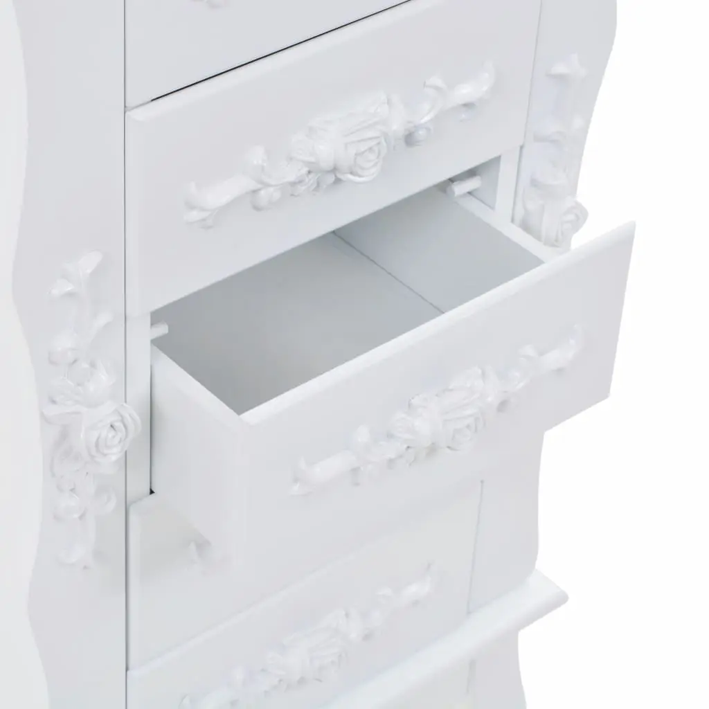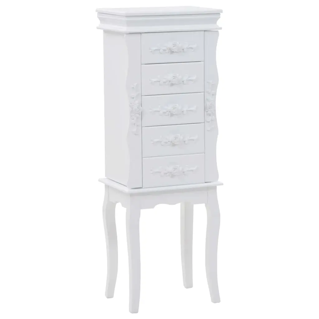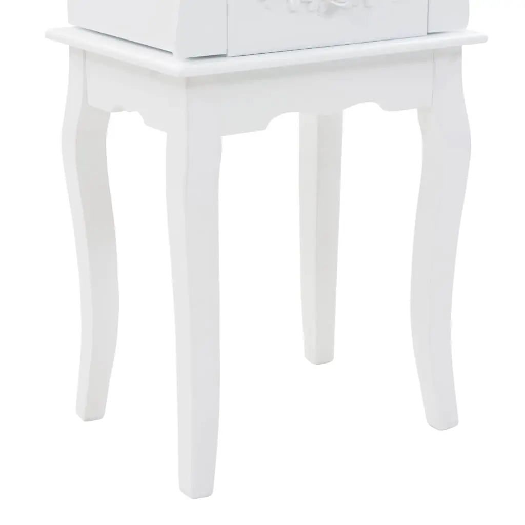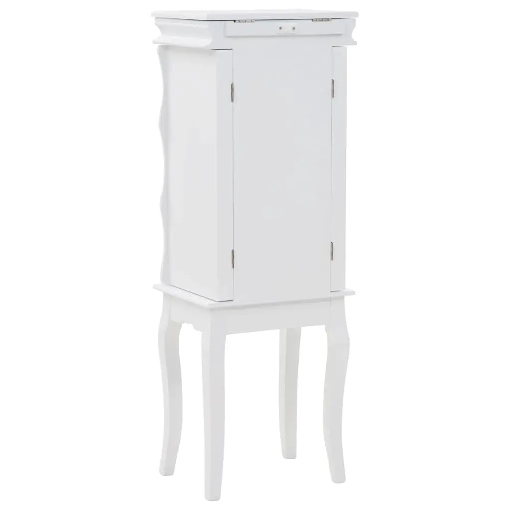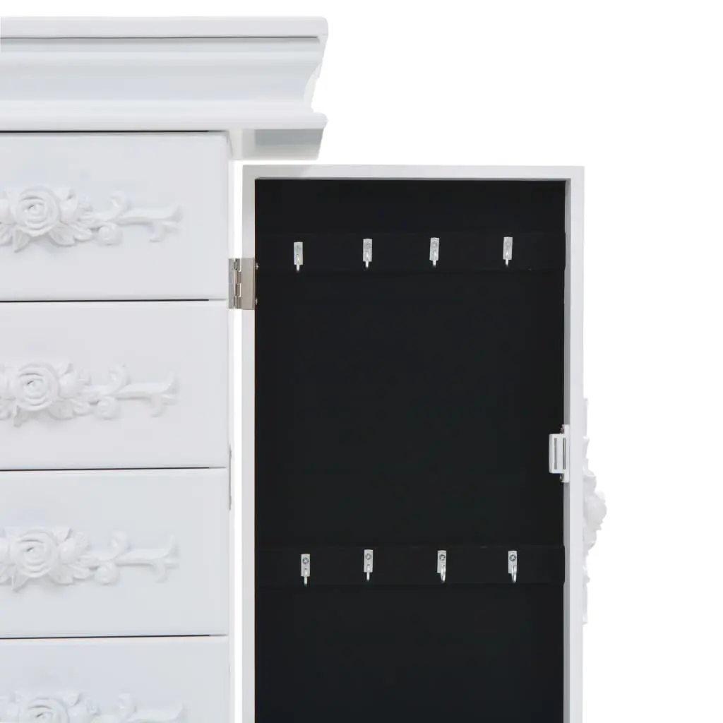 This free standing jewelery cabinet is ideal for you to neatly store earrings, necklaces, bracelets and other jewelery. This exquisite jewelery box is manufactured from medium density fibreboard (MDF) and its four legs made of pine wood, which make it sturdy and durable. The cabinet is easy to clean and maintain. Our jewelery cabinet is easy to assemble.