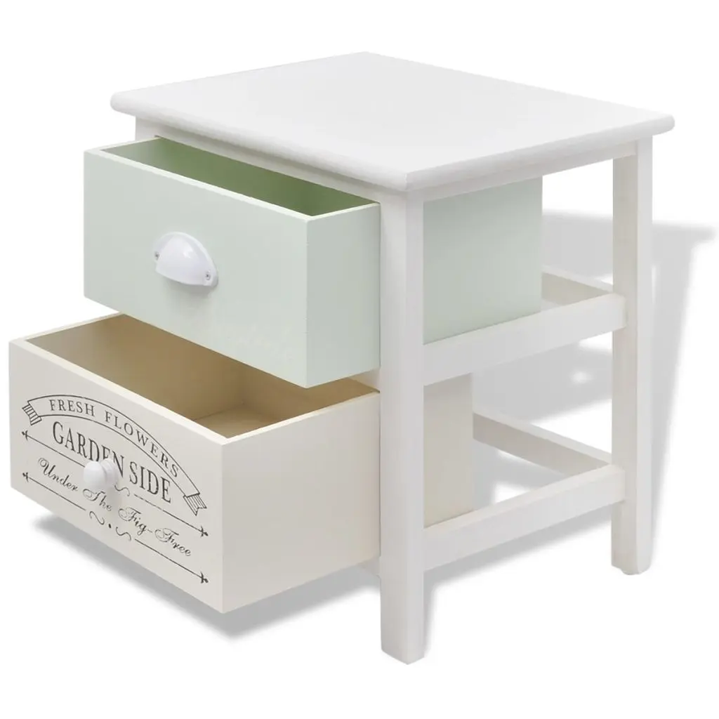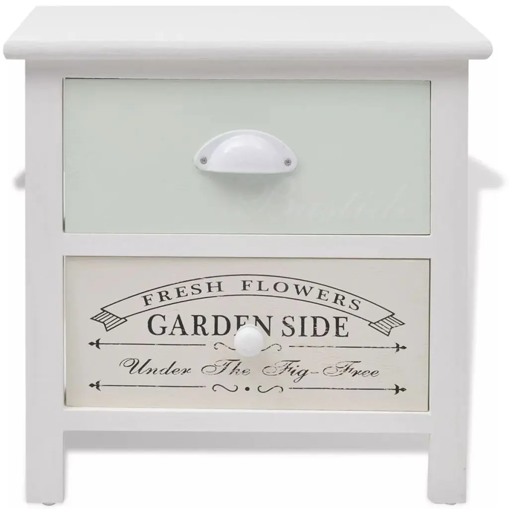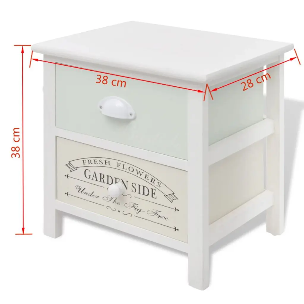 Add a touch of rustic charm to your home with these chic wooden bedside cabinets in a classic wooden French country house style! They can also be used as telephone stands, side cabinets, small cabinets, drawer cabinets, storage cabinets, nightstands, night cabinets, bedroom cabinets, end tables, end cabinets, etc. These compact cabinets each have 2 smoothly running drawers, which provide ample space for keeping smaller items organised and within reach. The drawers with vintage country-style prints add to the rural charm of the cabinet. The drawers can be exchanged. Made of high-quality materials, the cabinets are durable and easy to clean. Delivery includes 2 bedside cabinets.