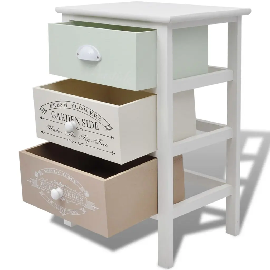 Add a touch of rustic charm to your home with this chic wooden storage cabinet in a classic French country style! This drawer cabinet has 3 smoothly running drawers, which provide ample storage space for your personal belongings and will help keep your room tidy. The drawers with vintage country-style prints add to the rural charm of the cabinet. The drawers can be exchanged. You can also display things such as photos, books and potted plants on top of the hall cabinet. Made of high-quality materials, the side cabinet is durable and easy to clean.