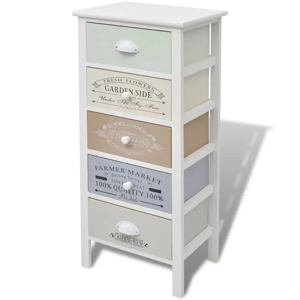 Add a touch of rustic charm to your home with this chic wooden storage cabinet in a classic French country style! This drawer cabinet has 5 smoothly running drawers, which provide ample storage space for your personal belongings and will help keep your room tidy. The drawers with vintage country-style prints add to the rural charm of the cabinet. The drawers can be exchanged. You can also display things such as photos, books and potted plants on top of the hall cabinet. Made of high-quality materials, the side cabinet is durable and easy to clean.