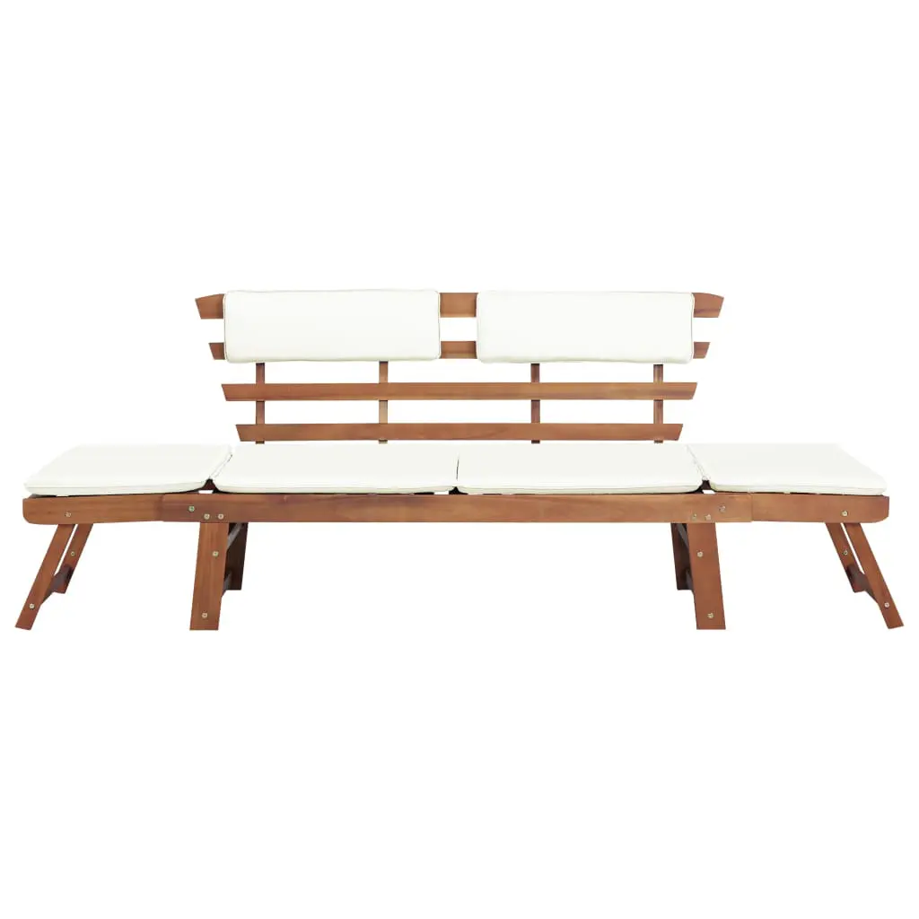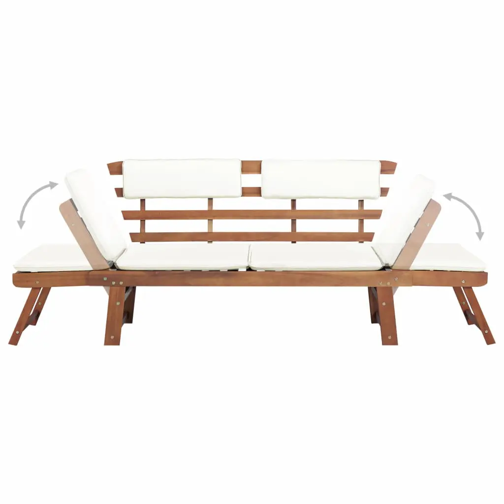 This outdoor wooden sun bed/garden bench combines style and functionality, and will become the focal point of your garden or patio. The sun lounger can be converted from a bench to a day bed and back again quickly and easily thanks to the adjustable sides. The thick, removable back and seat cushions will provide seating and lying comfort. The cushion covers can be easily removed and washed. Our sun bed/garden bench is made of acacia wood, a tropical hardwood, which is weather-resistant, and finished with a light oil coating. Therefore, it is suitable for outdoor use.