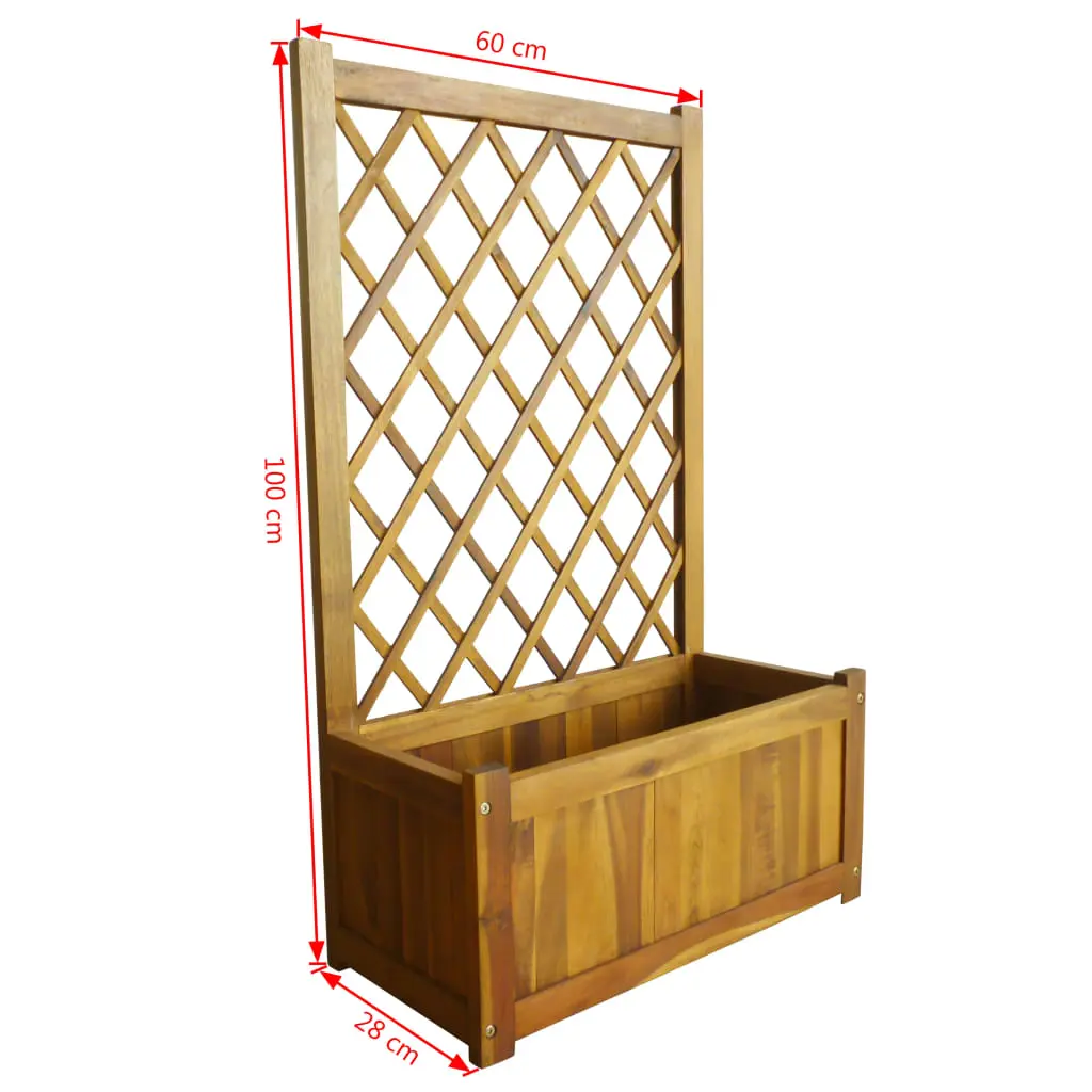 This wooden raised bed, featuring a built-in trellis, will become the focal point of your garden, patio or terrace. The planter is made of solid acacia wood that has been given a light oil finish to bring out its rich, natural colour and make it weather resistant. The planter has an understated, rustic design and will add a touch of natural charm to your outdoor living space. The garden planter has a large flower box, which can accommodate a considerable number of plants and flowers. The integrated trellis will add a gorgeous, decorative effect when covered with beautiful climbing plants. Assembly is easy. Please note that wood is a natural product and may show imperfections.