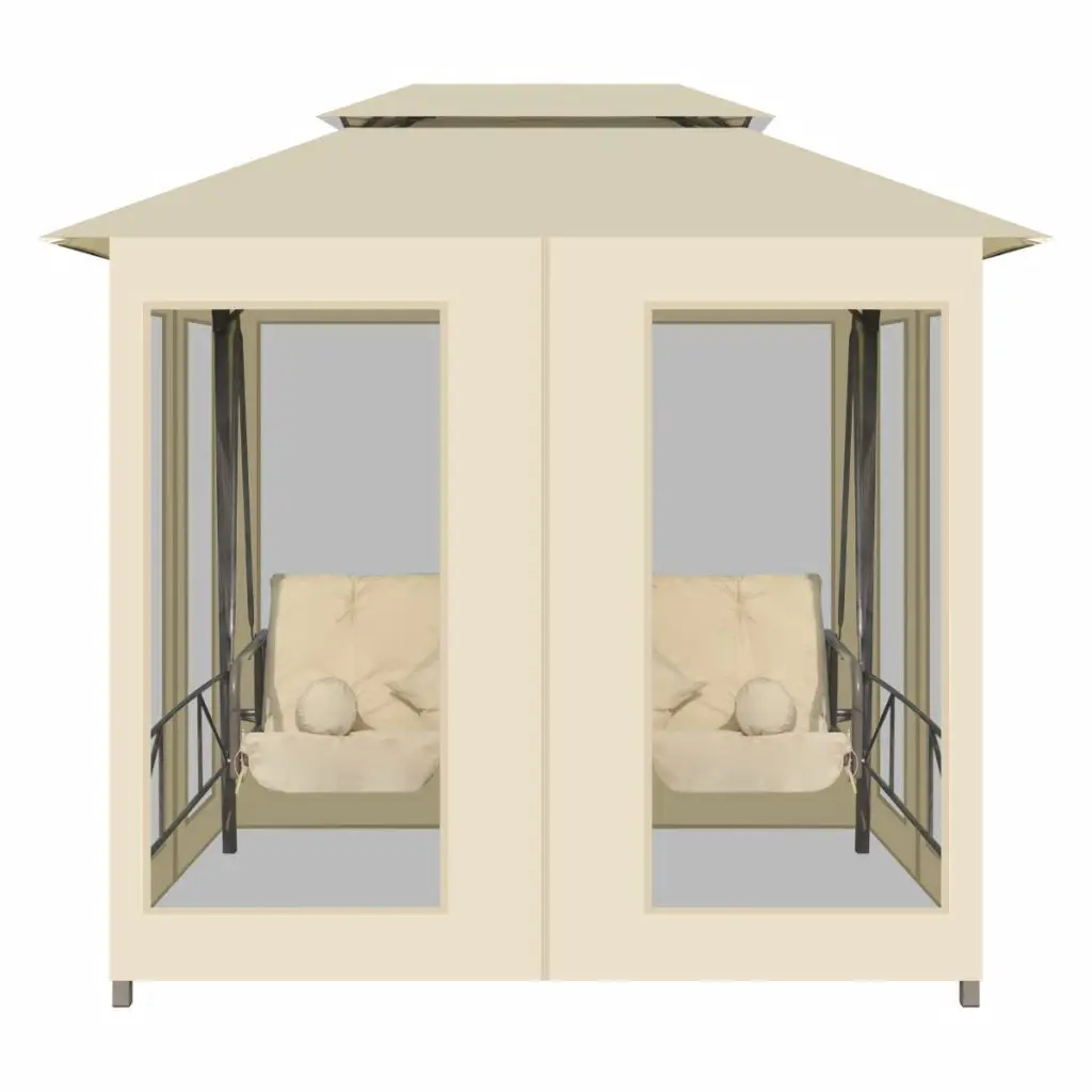 This stylish and spacious gazebo swing chair, featuring a spacious and stylish design, comfortably seats two persons and provides shade from the sun with its large canopy. Thanks to the fitted curtains with hook and loop fasteners, you can easily close all four sides to create an enclosed area. The closed mesh is perfect for keeping flying insects out and giving you a private retreat. The seat can be converted to a bed. Two rectangular pillows and two cylindrical pillows are included for added comfort. This stylish and spacious gazebo swing bench, featuring a spacious and stylish design, comfortably seats two persons and provides shade from the sun with its large canopy. Thanks to the fitted curtains with hook and loop fasteners, you can easily close all four sides to create an enclosed area. The closed mesh is perfect for keeping flying insects out and giving you a private retreat. The seat can be converted to a bed. Two rectangular pillows and two cylindrical pillows are included for added comfort. The durable steel frame has been given a corrosion-resistant powder-coated finish. The waterproof polyester cushion covers are removable for easy cleaning. Assembly is also really easy.
