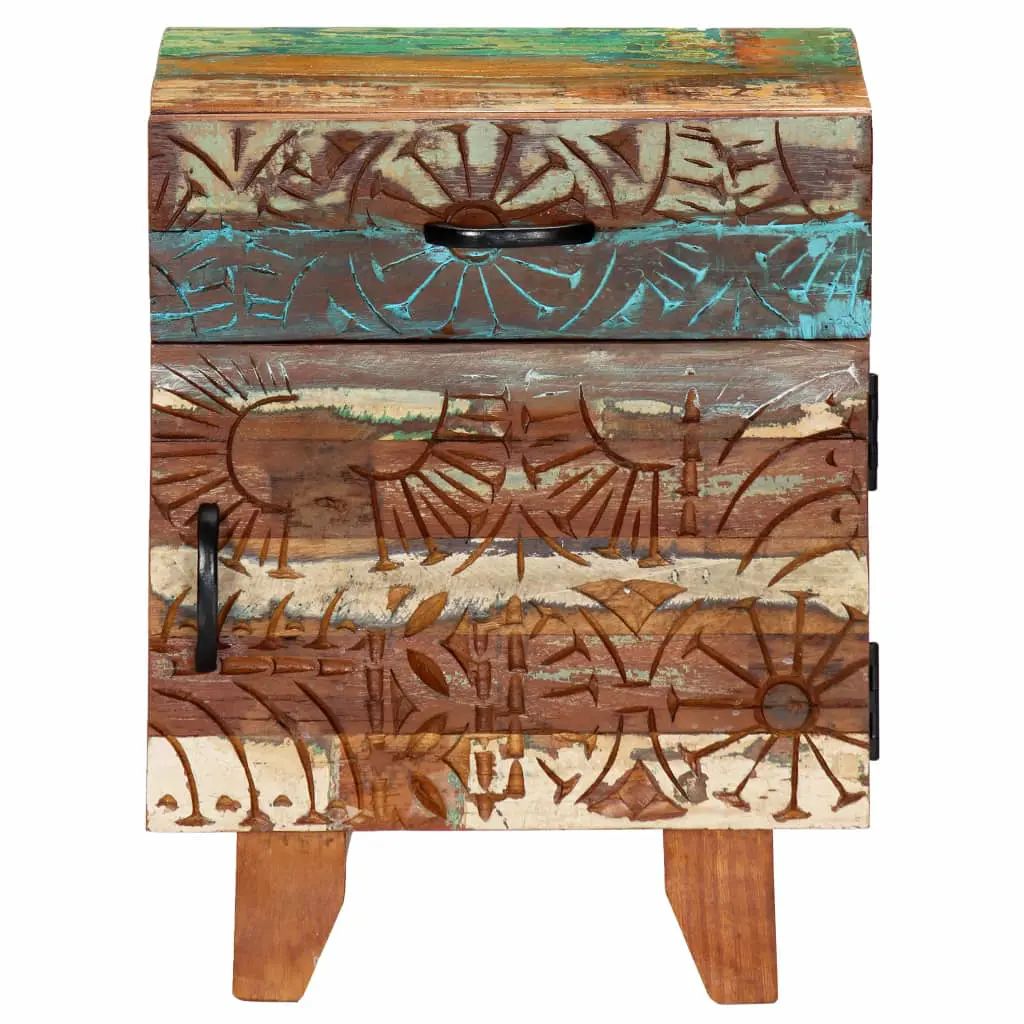 Bring the luxury of mid-century inspired design to your interior with our stylish solid wooden bedside cabinet! This colourful nightstand with antique hand carved pattern is made of solid reclaimed wood that has been sourced from joists, floors and support beams from old buildings being demolished, and it can consist of different types of wood like sheesham (rosewood), pine, teak, beech, oak, cedar, mango wood, acacia, etc. This means the reclaimed wood retains the characteristics of these different types of wood. Reclaimed wood is already aged, weathered and dried, so it doesn’t shrink or bend. Every step of the process is carried out with the greatest care, be it painting, polishing or lacquering. The exquisite craftsmanship and the graceful wood grains make every piece of furniture distinctive and slightly different from the next. Additionally, this vintage bed drawer cabinet is distinguished by 1 drawer and 1 door, offering an ideal solution for keeping your smaller items organised and within reach. The storage cabinet is easy to assemble. Important note: Colours and wood grains vary from piece to piece, making each of our bed cabinet unique; the delivery is random.