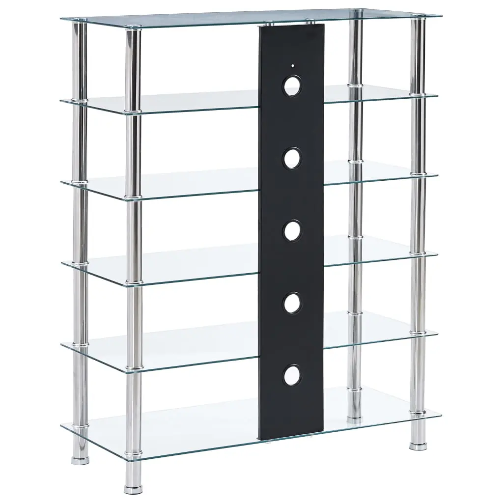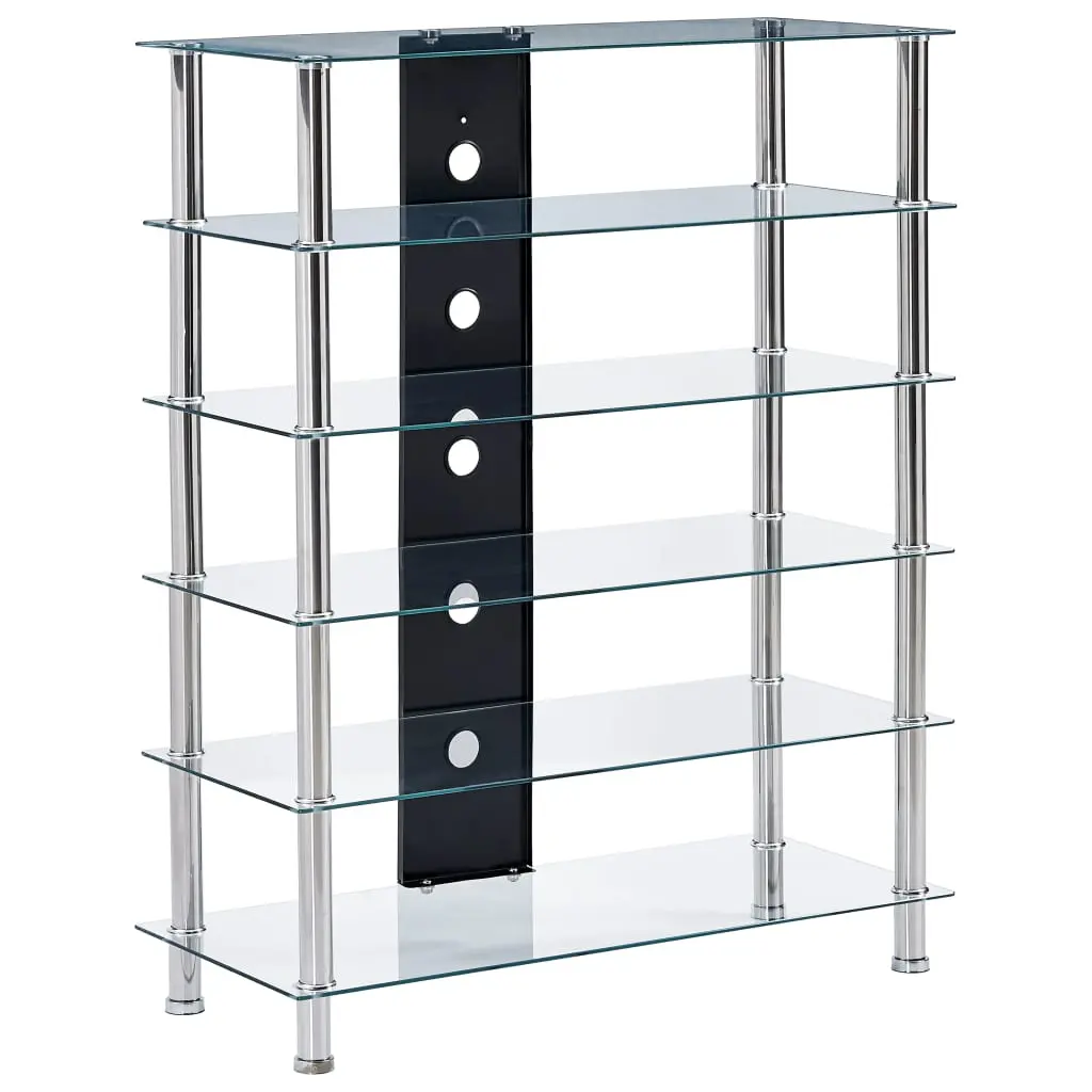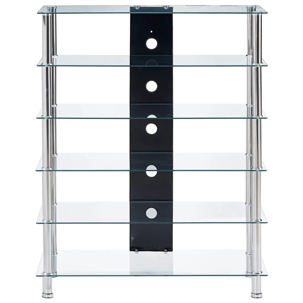 Instantly add a touch of style to your living space with our contemporary and practical glass HiFi stand! Made of thick tempered glass and heavy-durable stainless steel, this HiFi table is exceedingly sturdy and safe. The 5 shelves underneath the tabletop can accommodate your DVD player, game console, streaming device, receivers, media carriers, as well as various other items. Thanks to the cable accesses, all the cables will be neatly hidden. Additionally, the smooth surface is easy to clean with only a damp cloth. Our Hifi shelf is easy to assemble.