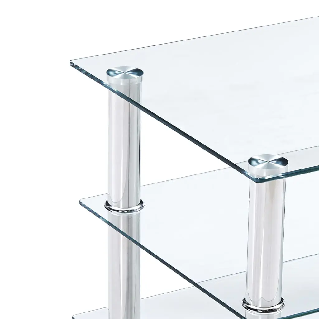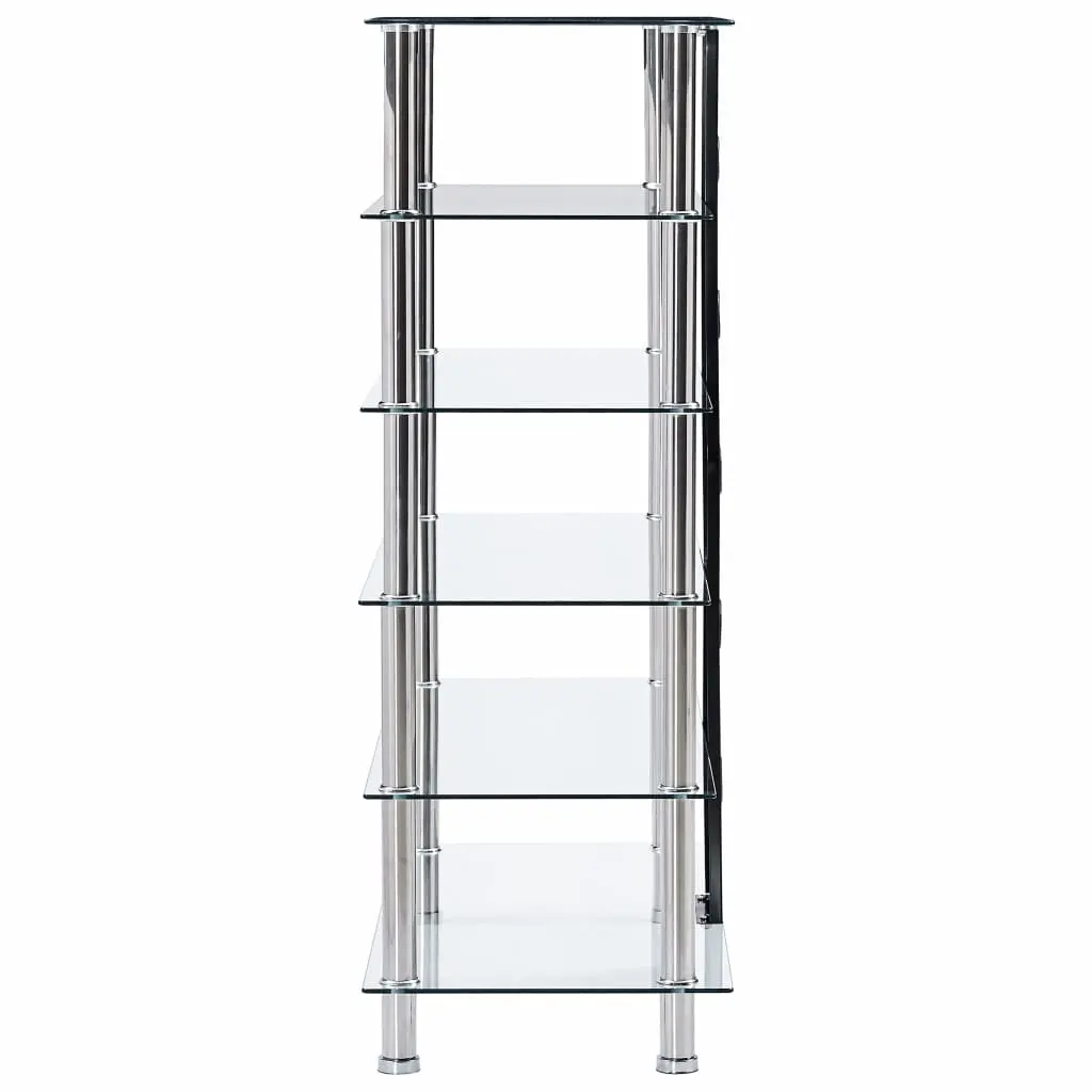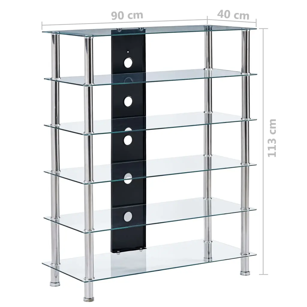 Instantly add a touch of style to your living space with our contemporary and practical glass HiFi stand! Made of thick tempered glass and heavy-durable stainless steel, this HiFi table is exceedingly sturdy and safe. The 5 shelves underneath the tabletop can accommodate your DVD player, game console, streaming device, receivers, media carriers, as well as various other items. Thanks to the cable accesses, all the cables will be neatly hidden. Additionally, the smooth surface is easy to clean with only a damp cloth. Our Hifi shelf is easy to assemble.