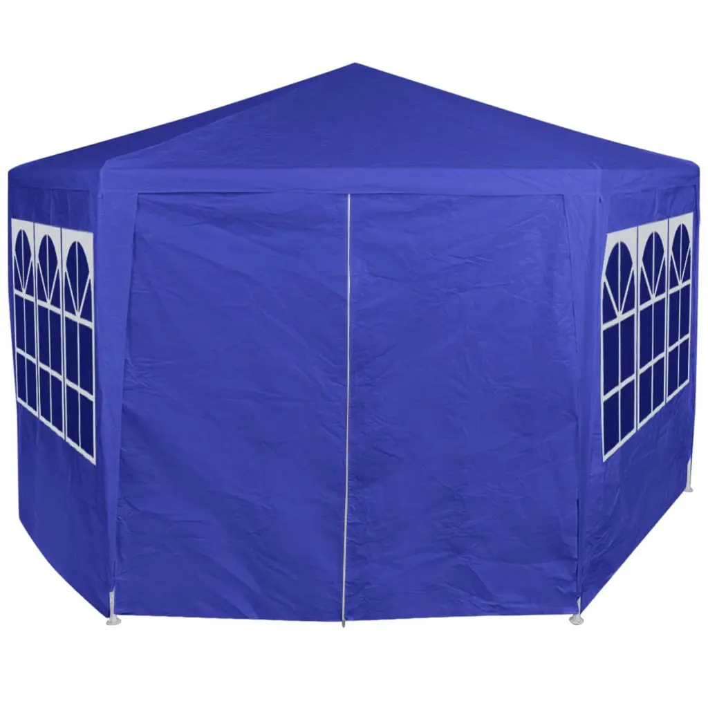 This hexagonal marquee will be ideal for a wide range of outdoor functions, such as shows, parties, camping trips, festivals and so on. You can also set it up in your backyard as a large sunshade for your family and guests. It is hard-wearing and can be used year-round. Made of 100% PE material, the tent fabric is UV protective and waterproof. There are 6 wall panels, each with decorative windows. The tent has zipped entrance for easy access. The frame is manufactured from rust-resistant steel and thus highly durable. Assembly is really easy. Delivery includes 1 marquee and installation accessories. NOTE: This product should NEVER be used under bad weather, such as strong wind, heavy rain, snow, storm, etc.