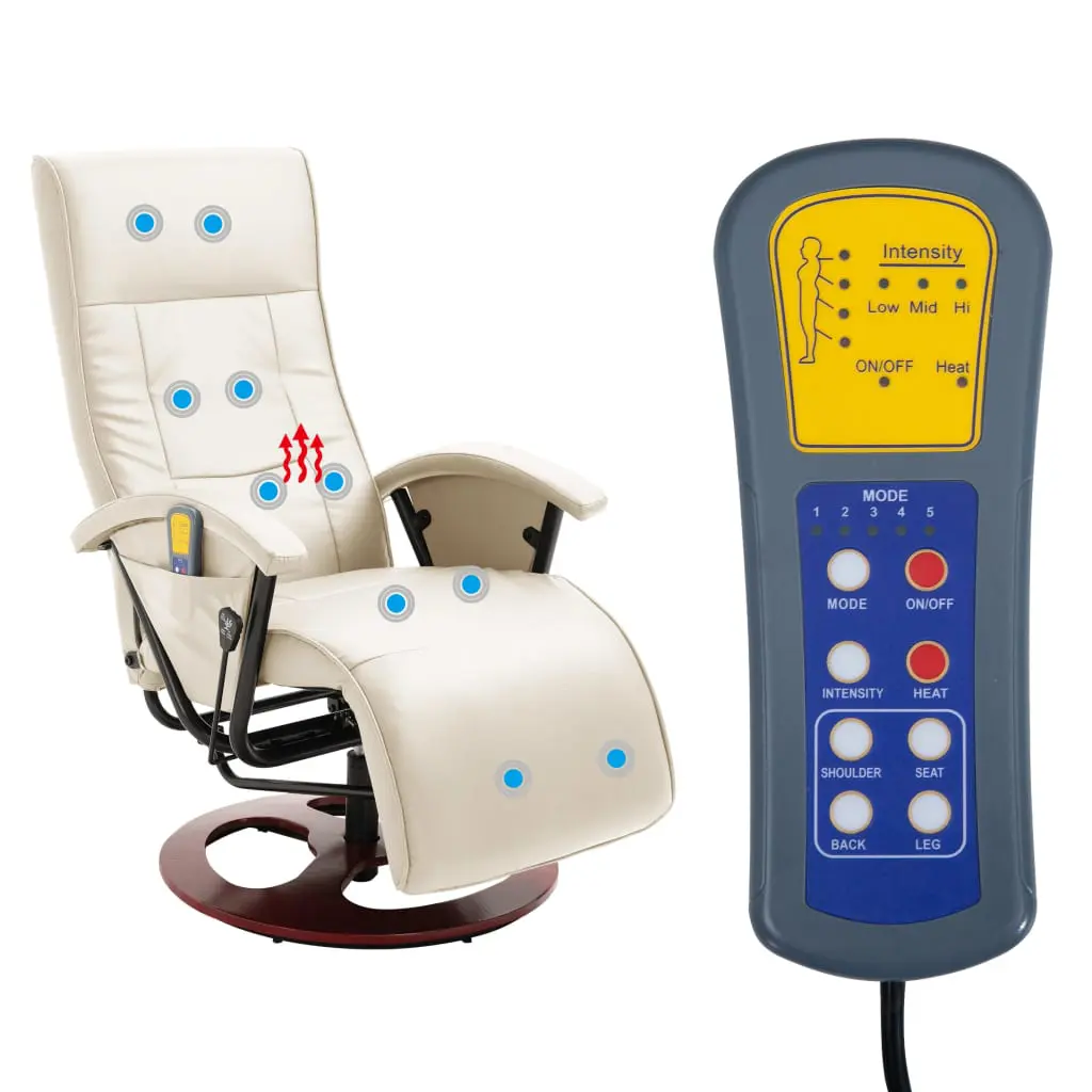 Provide yourself with a great seating solution with our comfortable massage chair! This massage chair has a remote control and 5 massage functions (kneading, tapping, shiatsu, vibrating, automatic) for your head, neck, back and legs, enabling you to fully relax at home or in the office. The seat can also be heated with a simple press of a button for even more comfort and relaxation. Made of synthetic leather, the chair is exceedingly durable, and the large wooden base makes the chair considerably stable. The seat of the massage chair can be rotated freely so you will never have to move the chair. The chair also has a built-in timer to control the length of the massage. This electric massage armchair features a classic design, giving you a relaxing vibration massage. The intensity of the massage is adjustable over three levels. The adjustable backrest allows you to even have a rest fully lying down. Thanks to its heat-emitting massage points, this electric massage armchairs ensure you an enjoyable evening. If you want to enjoy a convenient and pleasant massage at home, this electric massage armchair would be your first choice!
