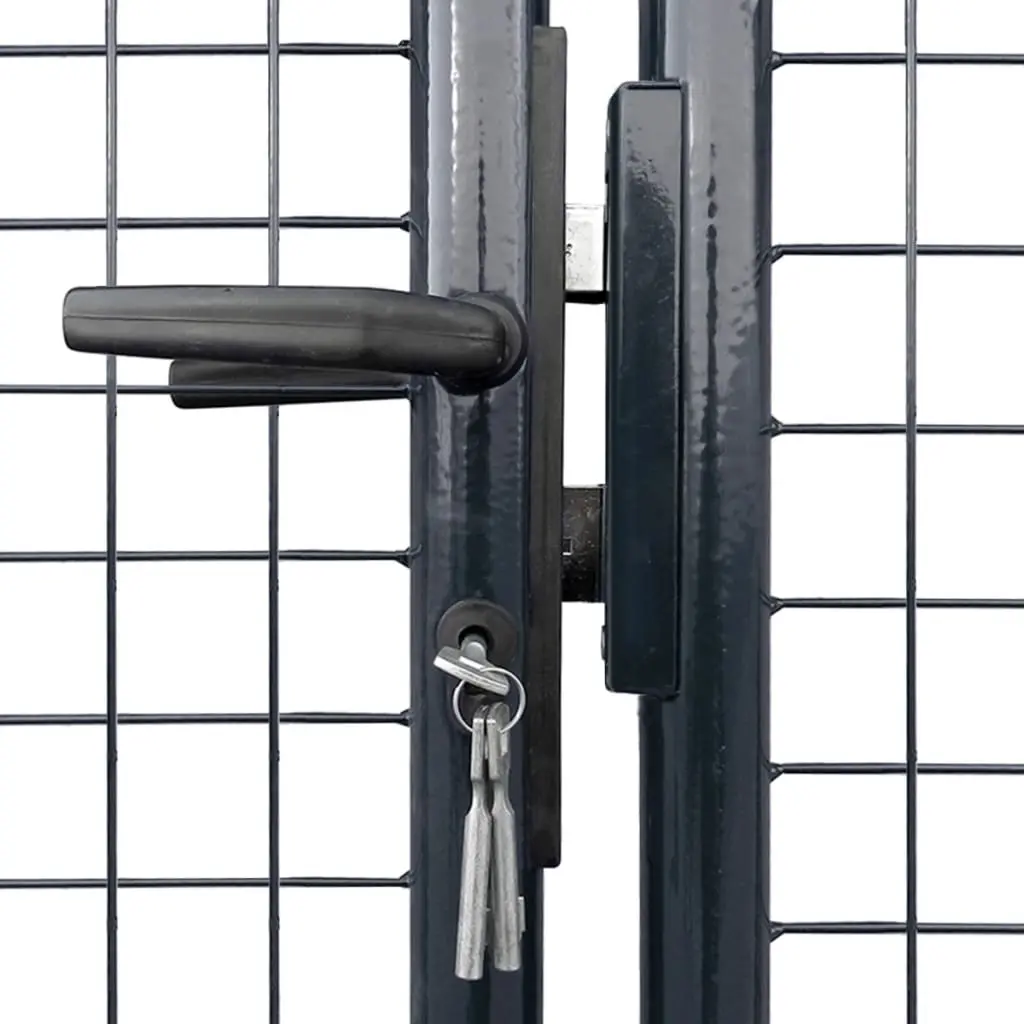Featuring a high level of stability and durability, this fence gate can be used as a practical, modern entryway for your garden, patio and terrace. The garden gate is perfect in workmanship and manufactured from galvanised steel with a powder-coated finish, which is rust resistant and forms a sturdy construction. It has two side posts with bolt hinges for easy installation. It also has a ground stake for the large bottom bolt, which ensures the gate can be locked well. Delivery also includes three keys.