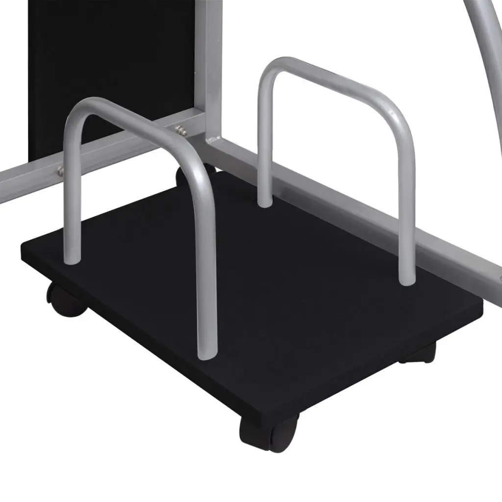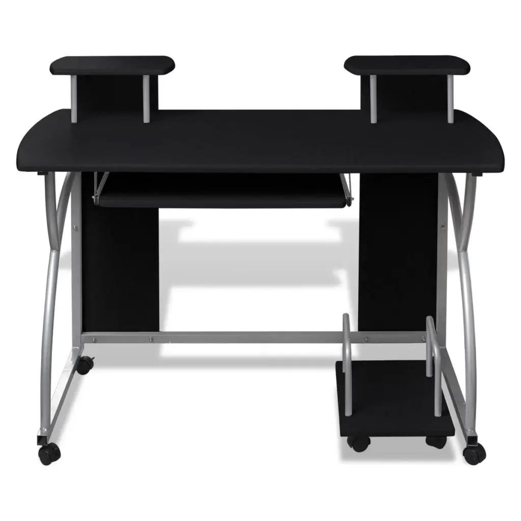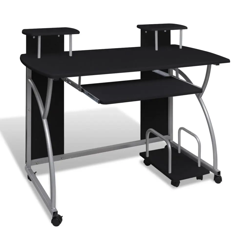 The compact computer desk for laptop and desktop is designed for space saving and will surely be an eye catcher in your room. The large table top work surface, together with two additional second shelves, will provide you additional organization and storage space. This computer desk is also designed with a sliding keyboard section and a portable bottom shelf of four castors for CPU tower or printer.Constructed of stable particle board and powder-coated steel frame, this computer desk will surely bring you years of service. Care instructions: wipe clean with clean damped cloth. The installed castors are designed for convenient mobility.