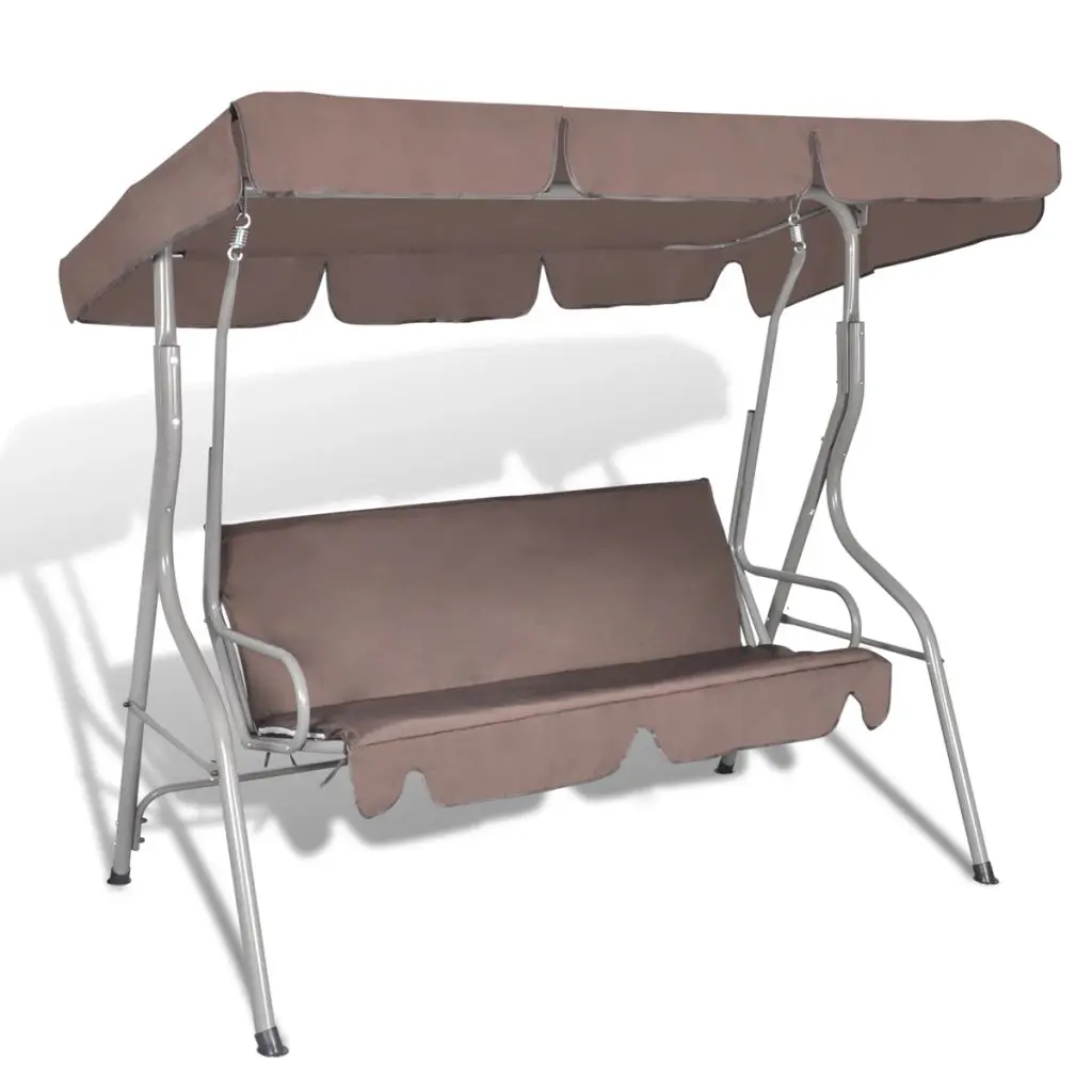 - A double swing bench with a seat cushion, a back cushion and a canopy