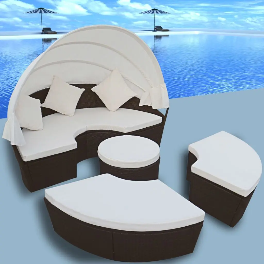 This 2-in-1 rattan lounge set is an ideal leisure and holiday companion to relax and enjoy yourself near the swimming pool, in your garden, on your balcony, etc. Thanks to its exclusive design, this outdoor lounge set offers total flexibility – it can also be set up together as a large round bed! Made of durable PE rattan, the lounge set is completely water – and weather proof, UV light resistant, stain resistant, easy to clean, and above all, environmentally friendly, so it will not fade in the sun. Thanks to the 7 cm thick seat cushions and 3 high quality pillows, it offers you ultimate seating comfort. The white polyester sunroof protects you from the burning sunlight when you read or relax in summer days. Constructed from a sturdy yet lightweight steel frame, this large rattan lounge set will surely bring you years of enjoyment. Note: We recommend covering the set during rain, snow and frost for its best service to last.
