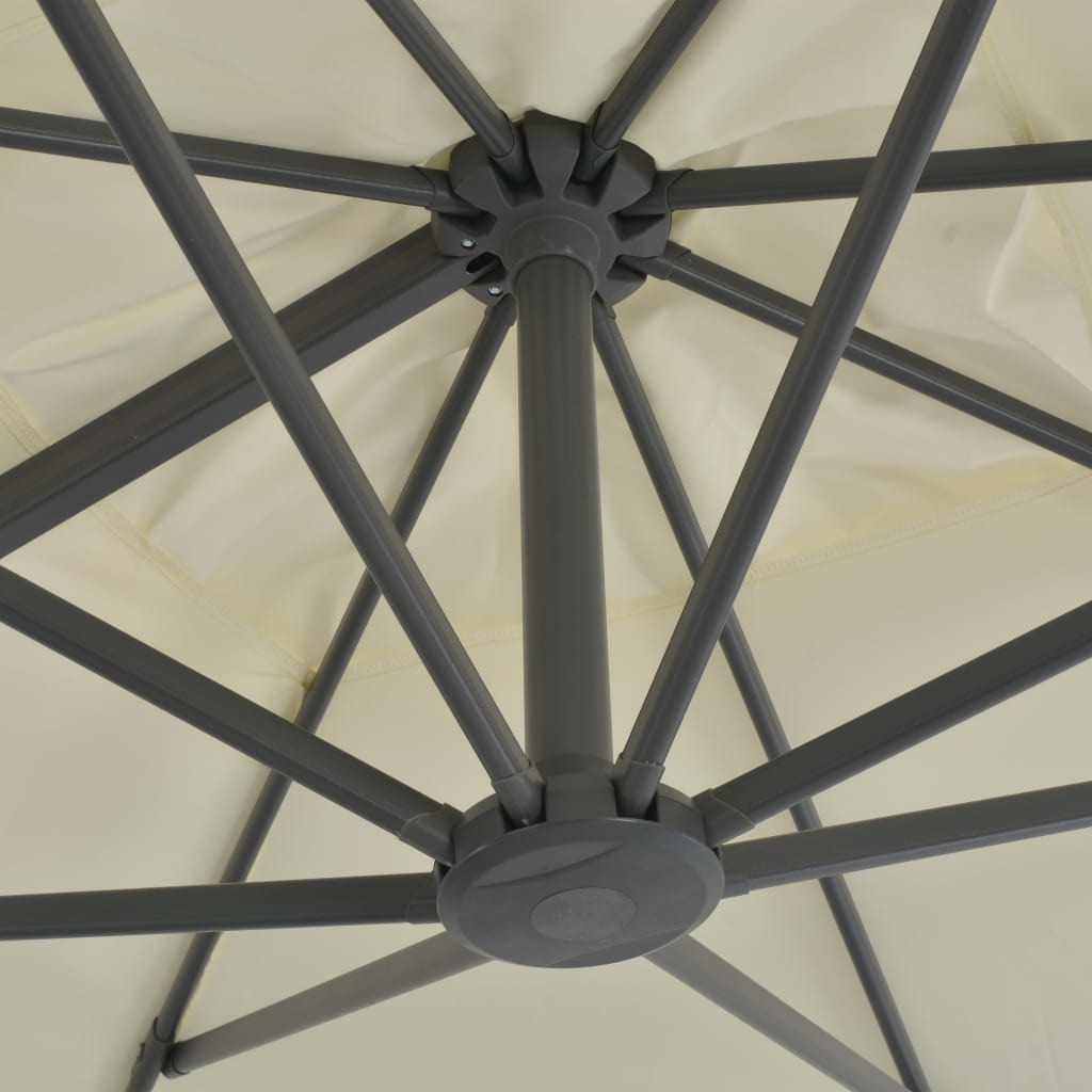 This parasol features a sturdy aluminium frame, a large UV-resistant cover and an extra portable base, so it is perfect for protecting you from sunlight. This garden umbrella can be easily opened and closed by simply turning the knob on the pole. The aluminium pole, along with the 8 sturdy aluminium ribs, makes the outdoor umbrella very durable. The exclusive design of this parasol allows you to tilt and rotate it in 360 degrees to block the sun. Moreover, the large, detachable steel cross base adds stability without taking up too much space. The extra parasol base consists of four separate parts and can be filled with 60 litres of water or 80 kg of sand. It is ideal for steadying parasols with a cross base. Pouring out the filler, the parasol base is light in weight, which makes it easy to carry.