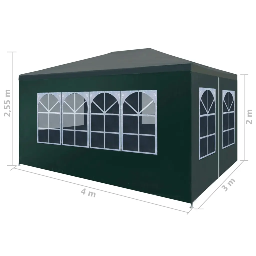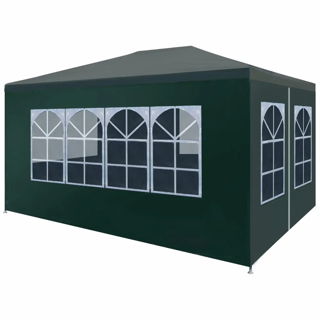 Our partytent provides a wonderful place to entertain your family and friends at all sorts of outdoor parties and get-togethers. The garden marquee is made of UV- and water-resistant polyethylene material and therefore very practical for outdoor use. The frame is manufactured from rust-resistant steel, making the outdoor canopy stable and durable. The party tent has side panels, each with decorative windows, and 1 door panel with a zip for easy entrance. The garden gazebo is easy to assemble. NOTE: We recommend treating the canopy with a waterproof spray if the marquee is subjected to heavy rainfall. This product should NEVER be used under bad weather, such as strong wind, heavy rain, snow, storm, etc. (We are not responsible for damage due to adverse weather conditions.)