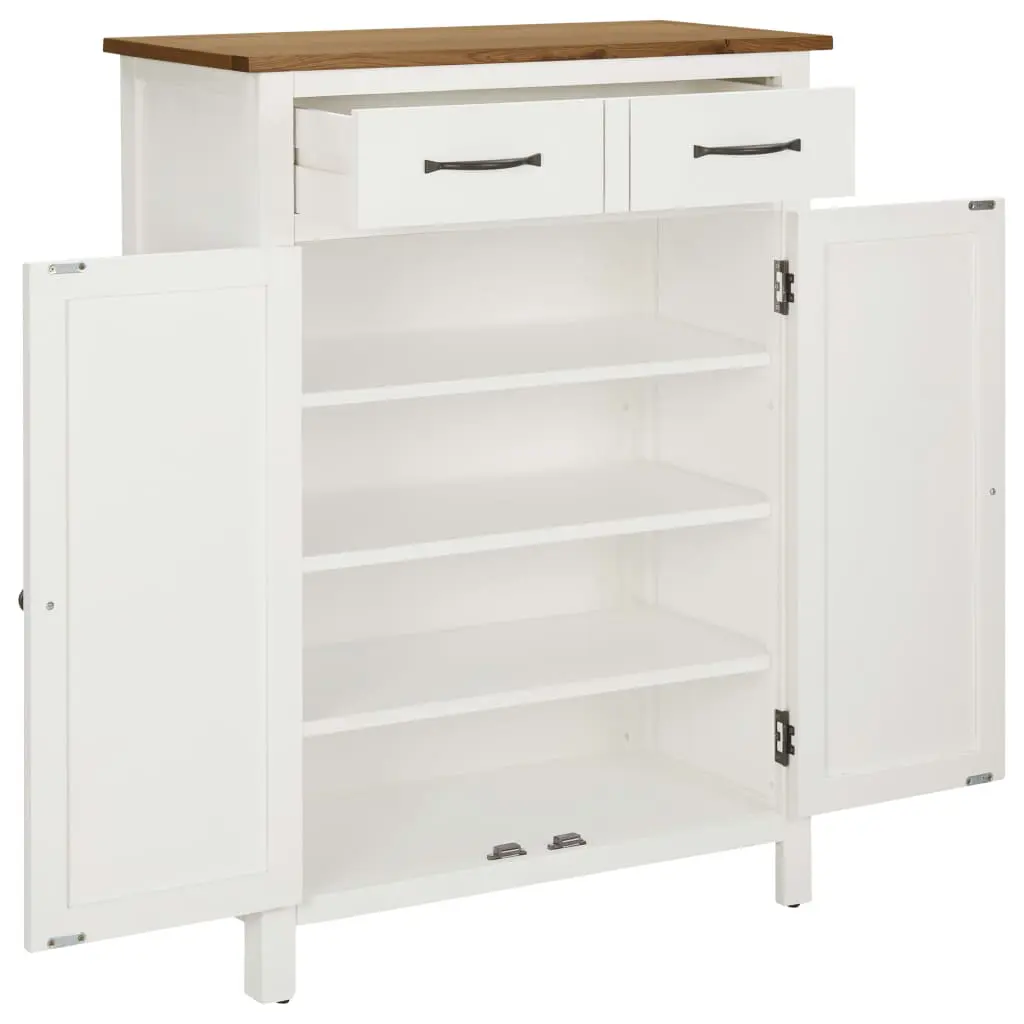 Get rid of the clutter! Our wooden shoe cabinet organises and conceals shoes that would otherwise clutter your walkways or closet floors. This shoe shelf features a top made of solid oak and MDF with oak veneer, featuring a solid acacia wood body. The clear-faced wood grains make every piece of storage cabinet slightly different from each other. What’s more! The two drawers and four shelves provide enough space to store your items in great order. Important note: The colour and grain may vary from piece to piece, making each of our storage organisers unique.