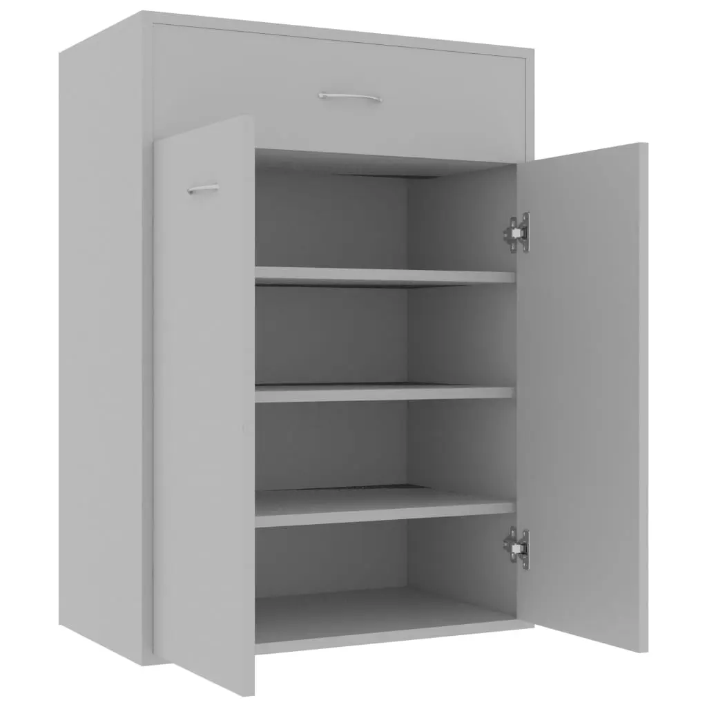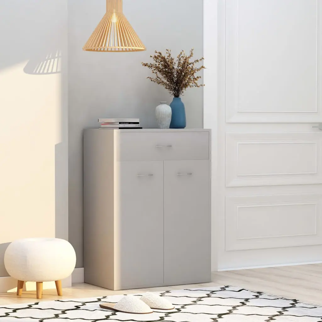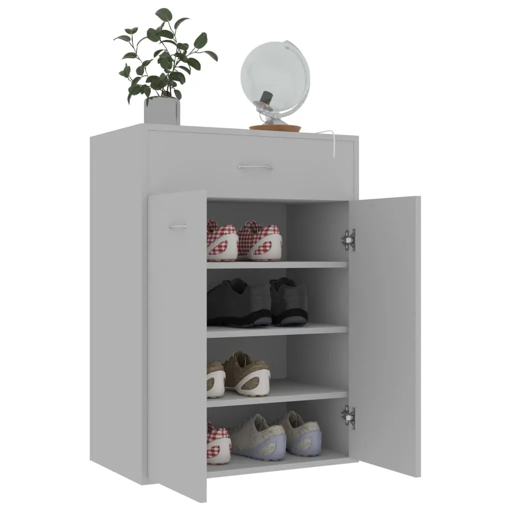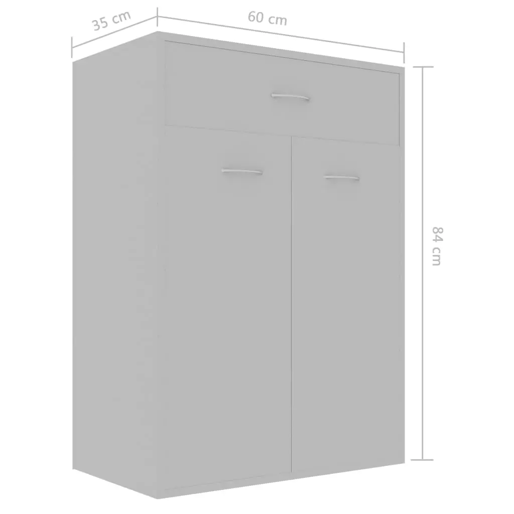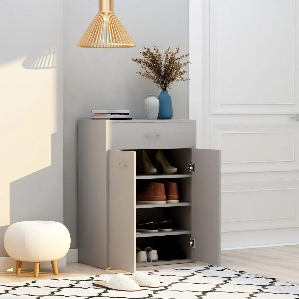 Keep your shoes organised and always at hand with our shoe rack! This rack is made of quality board, which is durable and sturdy for long service life. It is in a simple design, which can fit easily into your existing living space. With a drawer, 2 doors and 4 shelves insides, this rack can accommodate you keys, shoes, storage boxes, and decorative items, like vases. Wall mounting accessories and a wall anchor to prevent the rack from tipping over are included in delivery. It is easy to clean with damp cloth. The rack is easy to assemble.