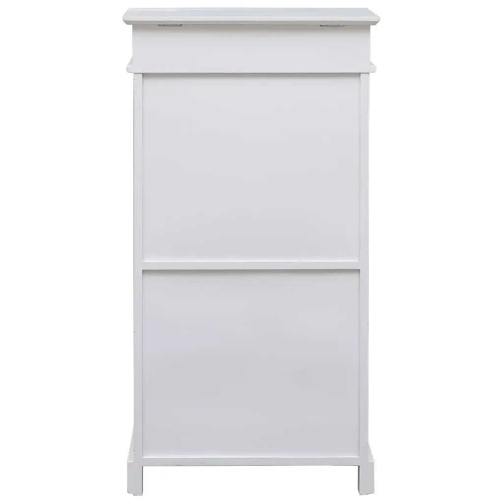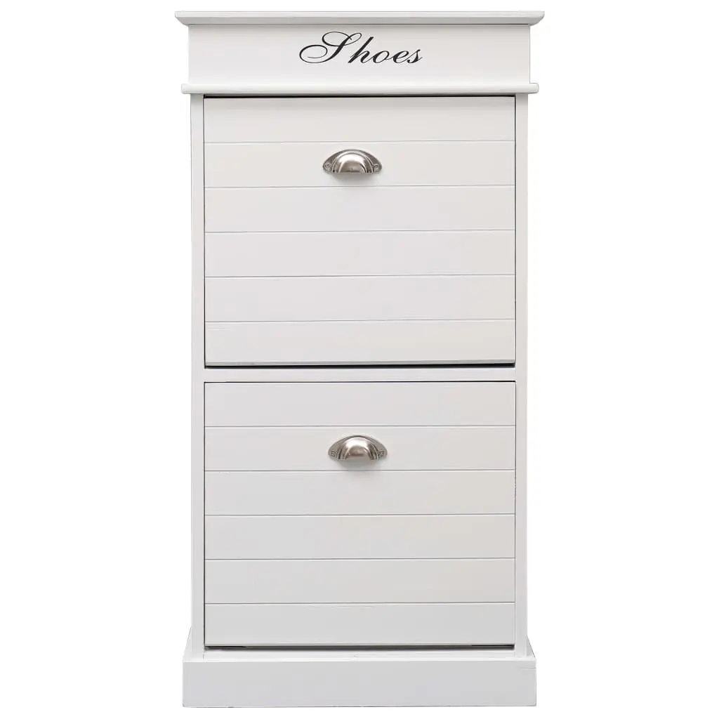 Our timeless wooden shoe cabinet presents an ideal shoe storage solution for your bedroom or hallway. You will no longer be annoyed by shoes cluttering your floor. It will also create a warm and welcoming ambience for your hallway or bedroom. Made of paulownia wood, this hall cabinet is exceedingly durable and sturdy. The 2 large tilting compartments have cross bars to keep things well-organised. Additionally, the cabinet top can be opened, and you can use the upper compartment to store shoe accessories such as shoelaces, shoe-pads, as well as various other small belongings. Our shoe organiser is easy to assemble.