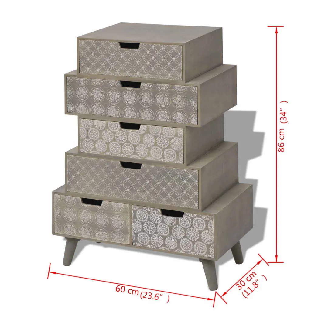 This side cabinet with 6 drawers has a retro design with elegant decorative patterns. The sideboard will make a practical as well as highly decorative addition to your bedroom, living area or lounge room. The rectangular top can be used to place a telephone or display decorative objects such as photo frames or potted plants. The six drawers provide ample space for keeping all kinds of smaller items organised and within reach. Thanks to the high-quality MDF material and the strong pinewood legs, this commode is very sturdy and durable. Assembly is really easy.