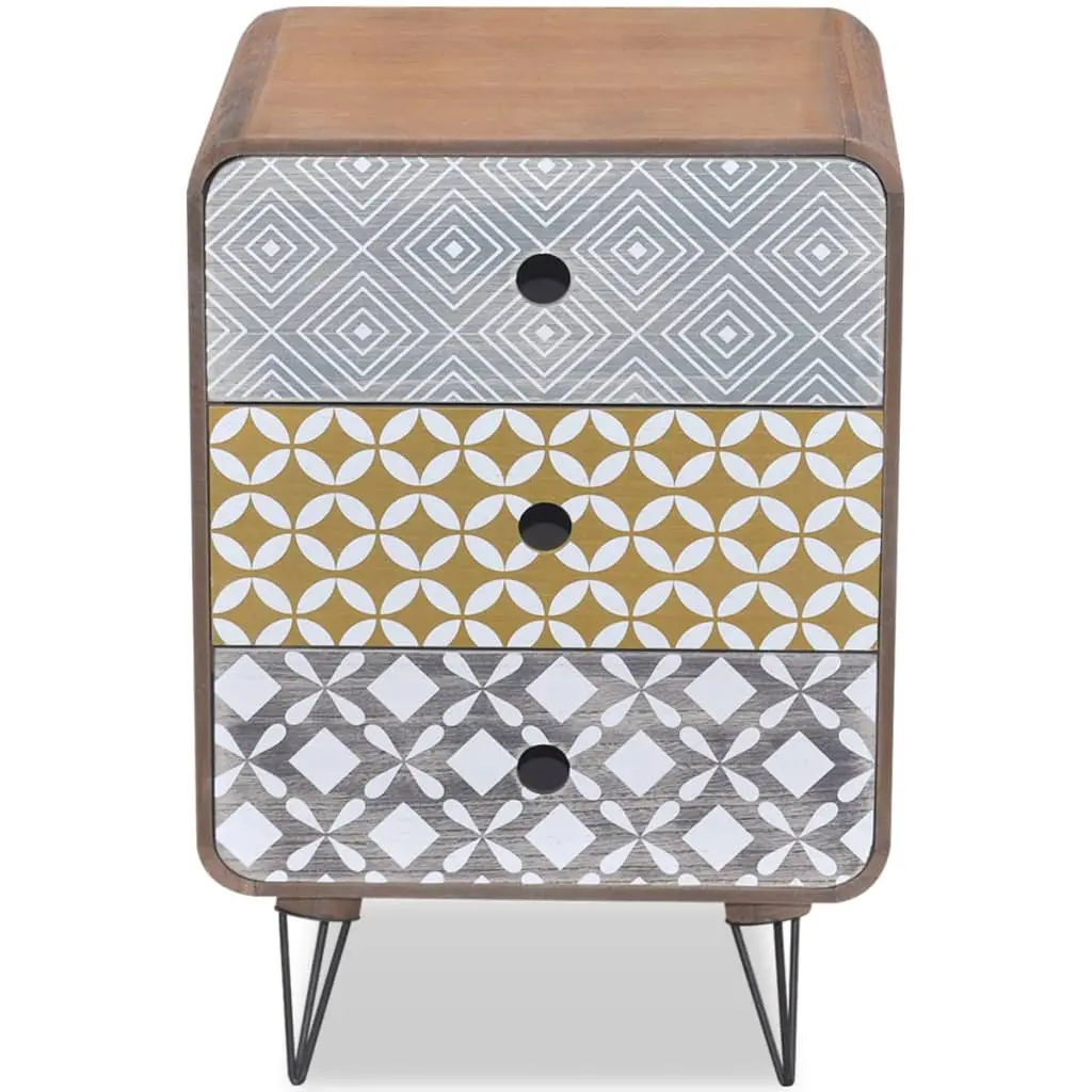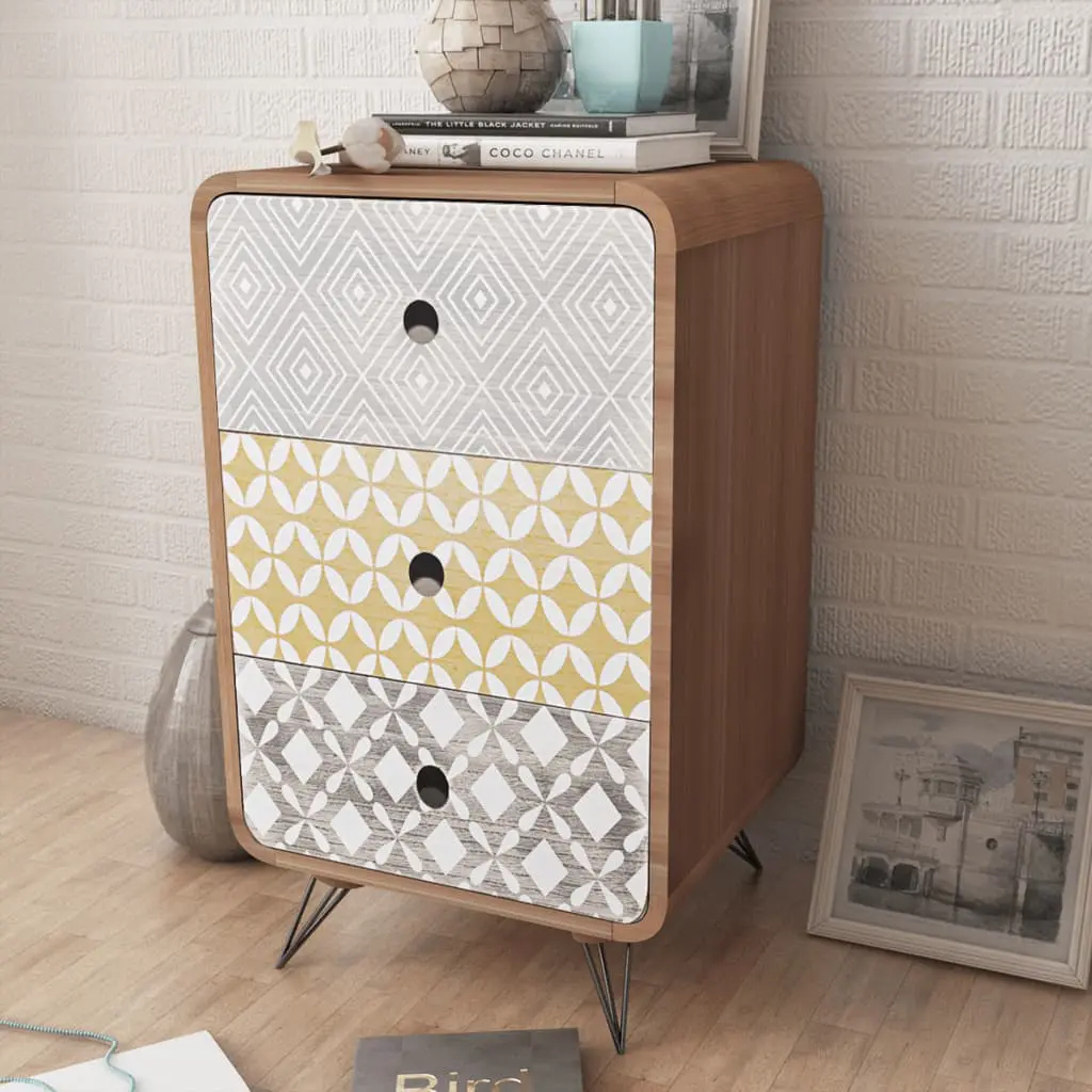 This side cabinet with 3 drawers has an understated but stylish design with elegant decorative patterns in different colours, and it can be used as a bedside cabinet or a telephone stand. This side cabinet will make a practical as well as highly decorative addition to your bedroom, living area or lounge room. The large tabletop is ideal for displaying decorative objects, photo frames, or even potted plants, while the three drawers provide ample space for keeping all kinds of smaller items organised and within reach. Thanks to the high-quality MDF material and the strong steel pin legs, this side cabinet is very sturdy and durable. Assembly is really easy.