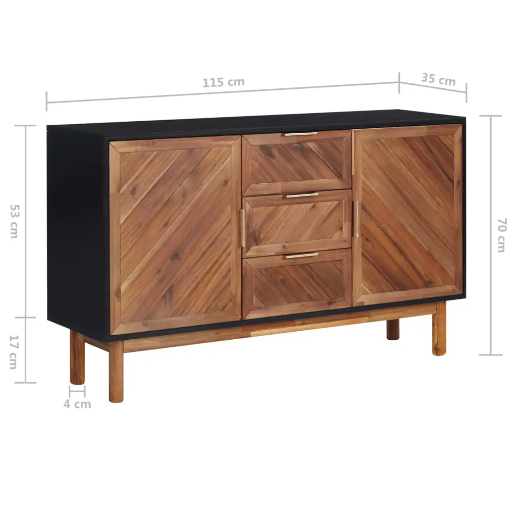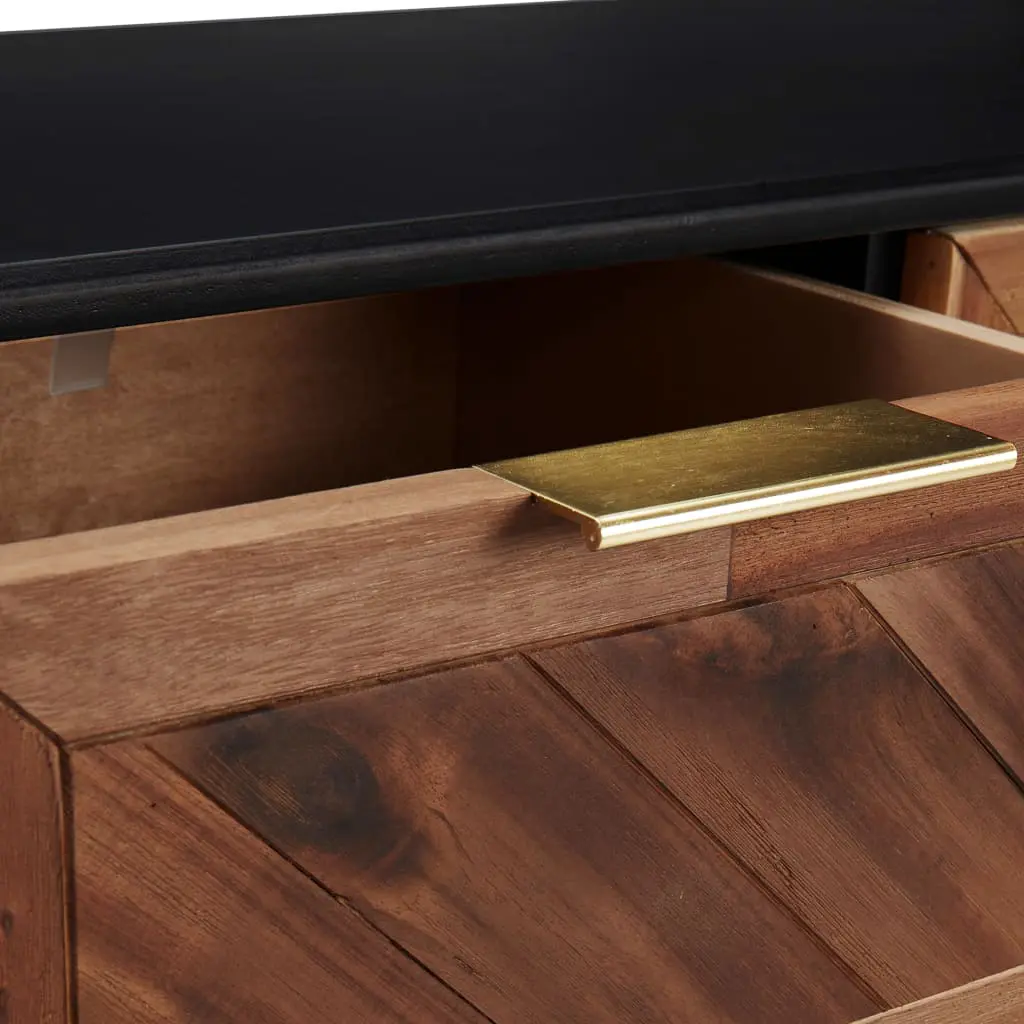 This sideboard is designed with the latest trend in colour and functionality in mind. The wooden sideboard is expertly crafted from solid acacia wood and MDF, making it very sturdy and durable. The cabinet features 3 drawers and 2 doors, providing ample storage space for books, multimedia appliances and other essentials. The sideboard top is ideal for displaying decorative objects, photo frames, or potted plants. The gold aluminium handles also make the storage cabinet stylish.
