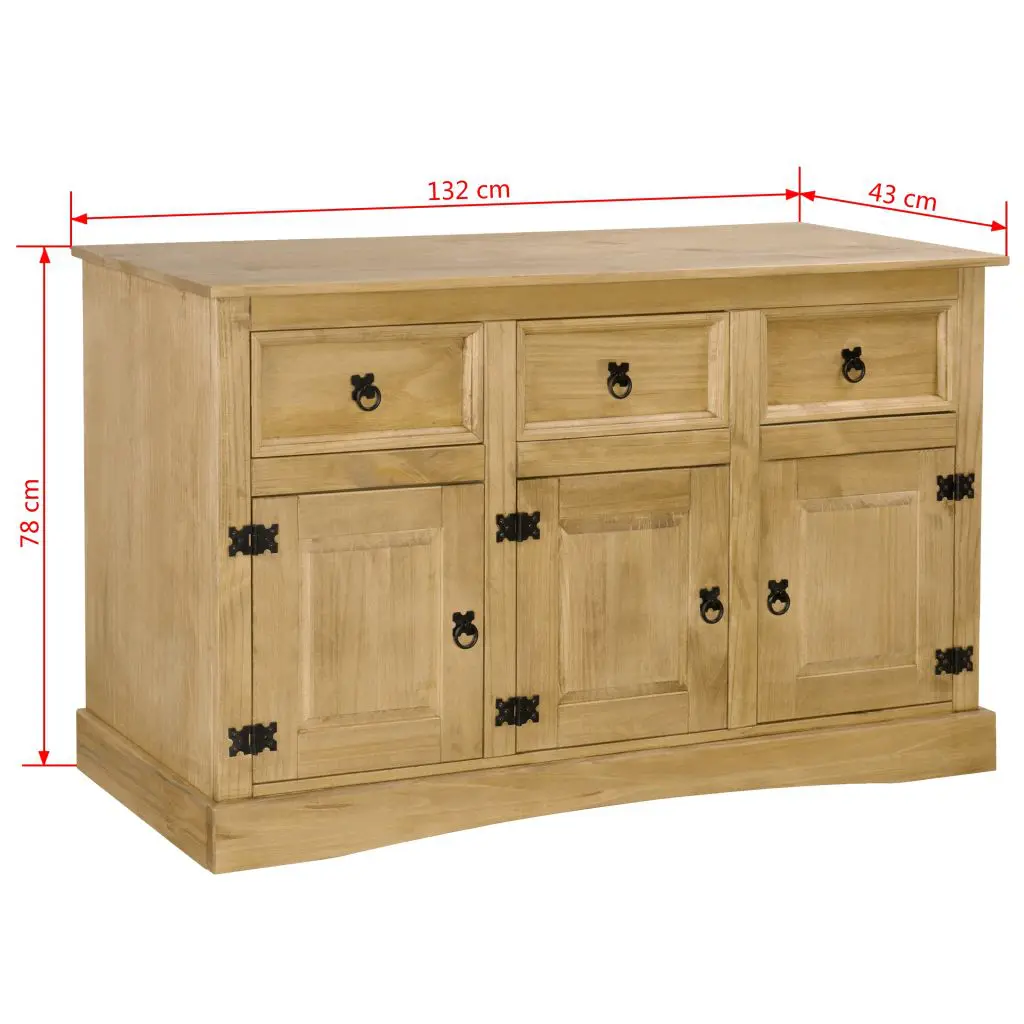 This high-quality wooden sideboard is a piece of furniture in the Mexican ‘Corona’ style. The waxed pine with black metal detailing exudes a rustic Mexican charm that will make the side cabinet a great addition to your living room, dining room or hallway. Crafted from solid pinewood, the sideboard is strong and robust. It has multiple drawers and compartments which provide ample storage space. The 3 doors help to keep your items dust free and out of sight. The sturdy top is ideal for placing fruit baskets, photo frames, potted plants and other decorative items. Assembly is really easy.
