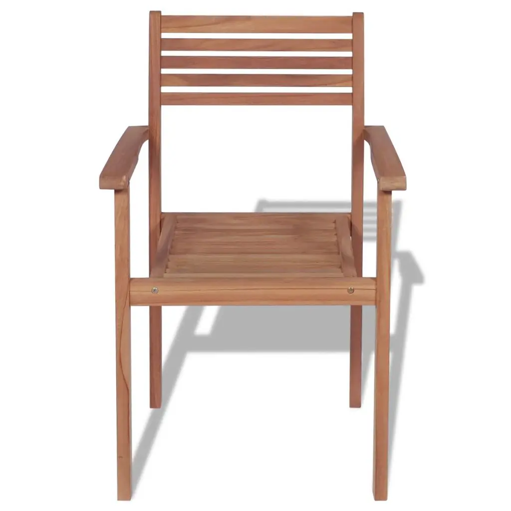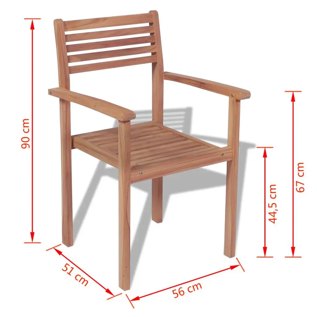 This set of outdoor wooden stackable chairs has a timeless design. Our chairs will suit a wide variety of settings, such as homes, offices, bars and cafes, thanks to their simple yet stylish design. Constructed from extremely durable teak hard wood, this piece of teak furniture has been seasoned, kiln dried and then fine sanded to give a very smooth appearance. Teak wood is known for its exceptional strength and weather resistance, making it far more suitable for garden furniture than any other kind of wood. Teak wood is the perfect choice if you want to purchase a long lasting piece of garden furniture. These chairs are stackable when not in use to save storage space. The products are applied with beautiful finish to give the wood a warm colour. Delivery includes 4 stackable chairs.