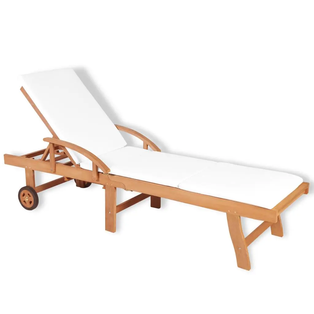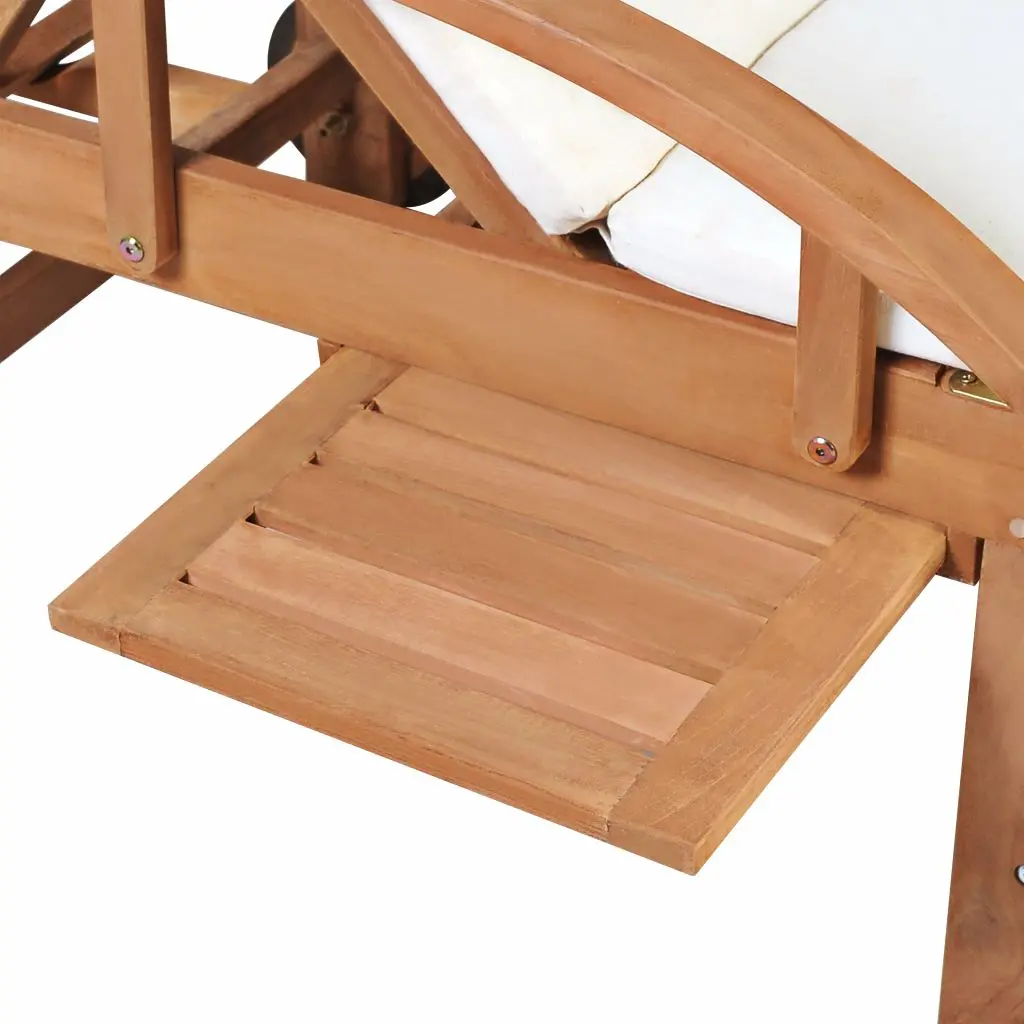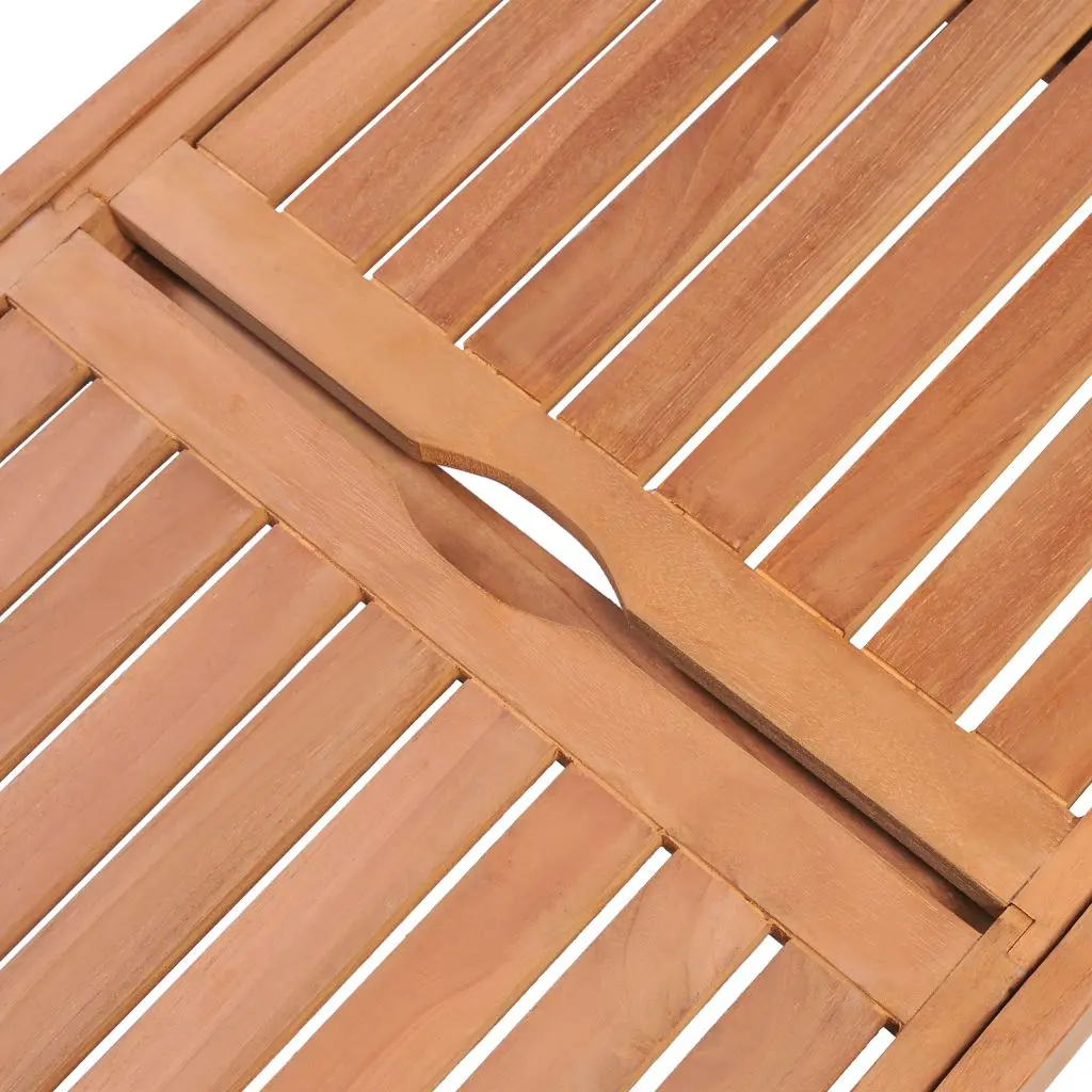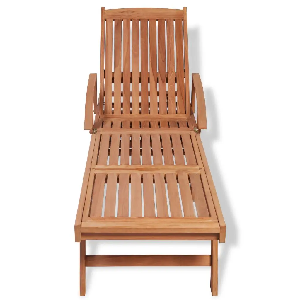 This classic teak sunlounger has an attractive slatted design and will add a touch of rustic charm to your garden, patio, pool deck or other outdoor space. Constructed from extremely durable teak hard wood, this piece of teak furniture has been seasoned, kiln dried and then fine sanded to give a very smooth appearance. Teak wood is known for its exceptional strength and weather resistance, making it far more suitable for garden furniture than any other kind of wood. Teak wood is the perfect choice if you want to purchase a long lasting piece of garden furniture. The product is applied with beautiful finish to give the wood a warm colour. The deck chair is equipped with 2 wheels so it can be easily moved around. The included cushion makes the sunlounger even more comfortable. It features a convenient sliding table on which you can keep your phone, sunglasses, drink and other small items within reach. The backrest can be adjusted in 5 positions, from fully upright to completely flat. The footrest is also adjustable. Take a load off and enjoy the sun on this lovely sunlounger!
