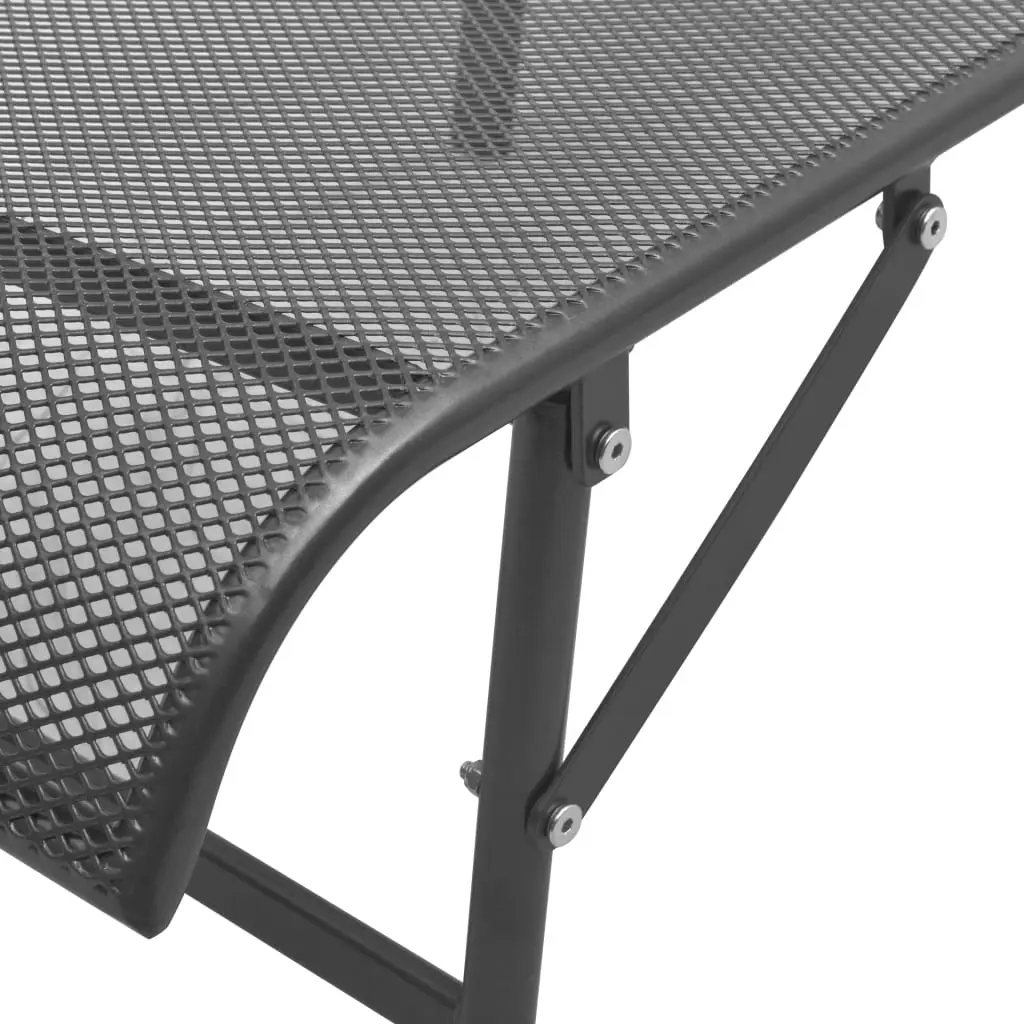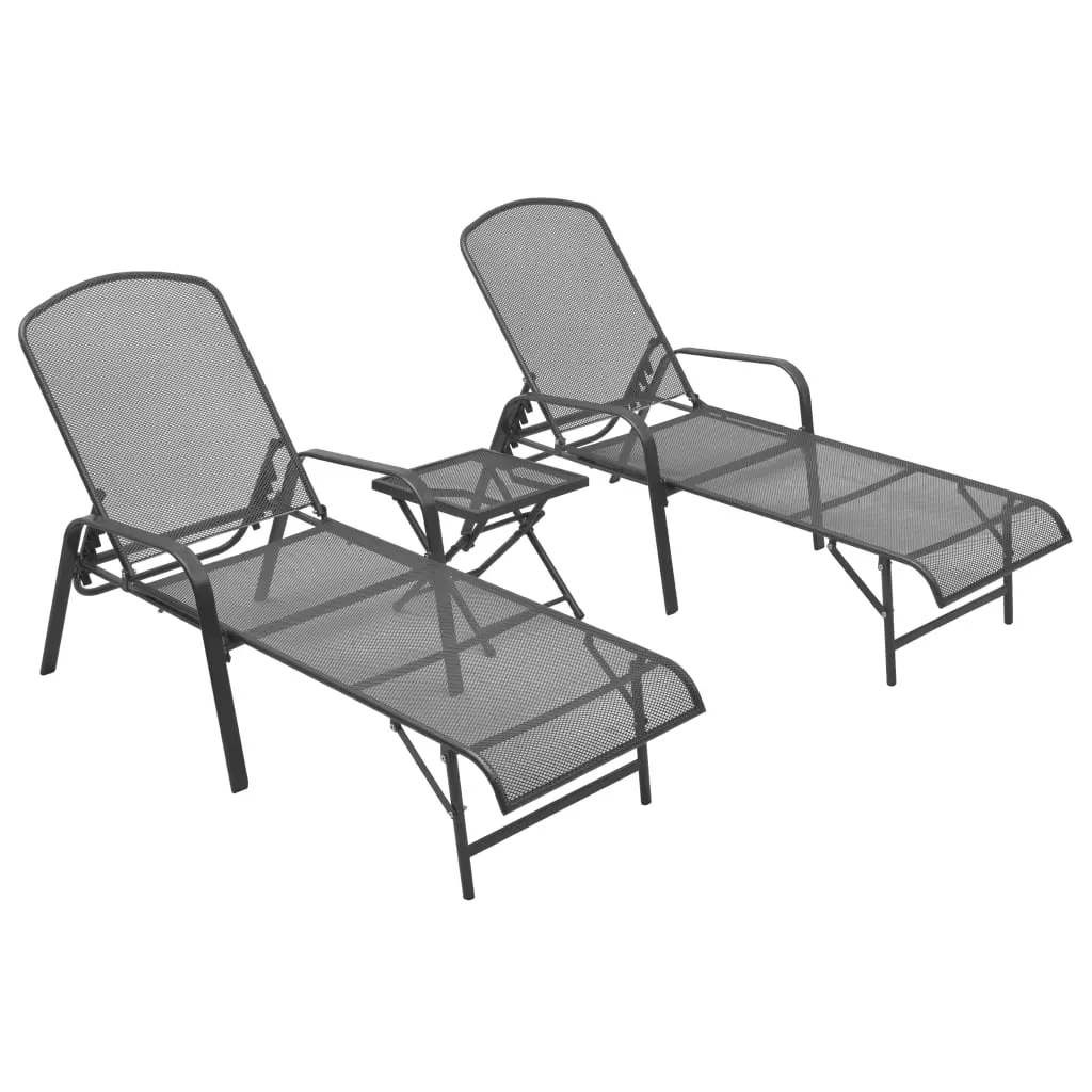 This set consists of 2 sun loungers and 1 folding table with a stylish mesh design, adding a touch of contemporary style to your outdoor or indoor living space. When you invite guests over, they will certainly marvel at our modern, industrial-style sun lounger set. The sun loungers feature a backrest that reclines in 5 positions to relax in a comfortable position as per your convenience. The stylish sun lounger set is perfect for enjoying your leisure time by the pool, in the patio, garden or living room. The sun lounger set is made of sturdy steel with an e-coating and powder coating. The metal sun lounger set is extra strong, durable, and weather-resistant and rust-resistant. It is also easy to clean and maintain thanks to the finish. The mesh design gives the set an elegant look. The table is perfect for keeping food and drinks within reach. It can be easily folded away when not in use.