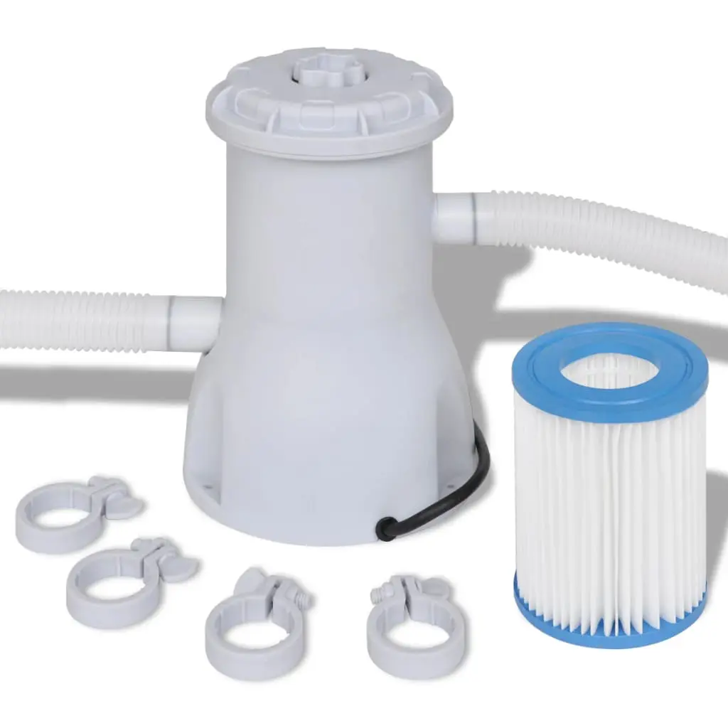 This amazing swimming pool set will bring your family and you years of fun in the backyard. The set includes the swimming pool and a filter pump. Made of durable 3-layer laminated material of heavy duty PVC with a polyester mesh, this stylish pool will hold a capacity up to 8870 L. The quality steel frames bring super stability and ensure the pool a long service life and excellent durability. The pool can be set up in a quick and easy way. With the drain plug, the water can be discharged easily and quickly. This pool has 2 connections to connect a filter pump to it. Moreover, it’s easy to fold away for storage and transport when not in use. The included electric filter pump is perfect for above-ground swimming pools, serving as a part of the circulation system to keep water clean. It delivers excellent filtering performance with 800 gallons per hour, which equals to 3028 L / h. The filter in the pump housing can be quickly removed for debris-tipping and cleaning. You can also find the replacement filters in our shop with the SKU 90568. Thanks to the reinforced plastic housing, this pool filter pump ensures all-weather performance, offering a long-term service life. Delivery includes 1 x swimming pool, 1 x pump, 1 x filter, 2 x hoses and 4 x metal clamps.