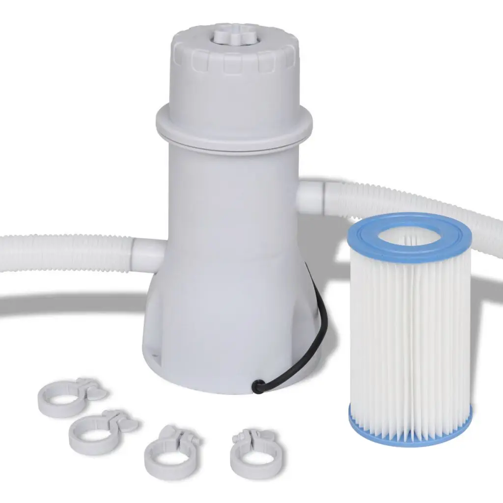 This amazing swimming pool set will bring your family and you years of fun in the backyard. The set includes the swimming pool and a filter pump. Made of durable 3-layer laminated material of heavy duty PVC with a polyester mesh, this stylish pool will hold a capacity up to 12945 L. The quality steel frames bring super stability and ensure the pool a long service life and excellent durability. The pool can be set up in a quick and easy way. With the drain plug, the water can be discharged easily and quickly. This pool has 2 connections to connect a filter pump to it. Moreover, it’s easy to fold away for storage and transport when not in use. The included electric filter pump is perfect for above-ground swimming pools, serving as a part of the circulation system to keep water clean. It delivers excellent filtering performance with 1000 gallons per hour, which equals to 3785 L / h. The filter in the pump housing can be quickly removed for debris-tipping and cleaning. You can also find the replacement filters in our shop with the SKU 90569. Thanks to the reinforced plastic housing, this pool filter pump ensures all-weather performance, offering a long-term service life. Delivery includes 1 x swimming pool, 1 x pump, 1 x filter, 2 x hoses and 4 x rubber clamps.