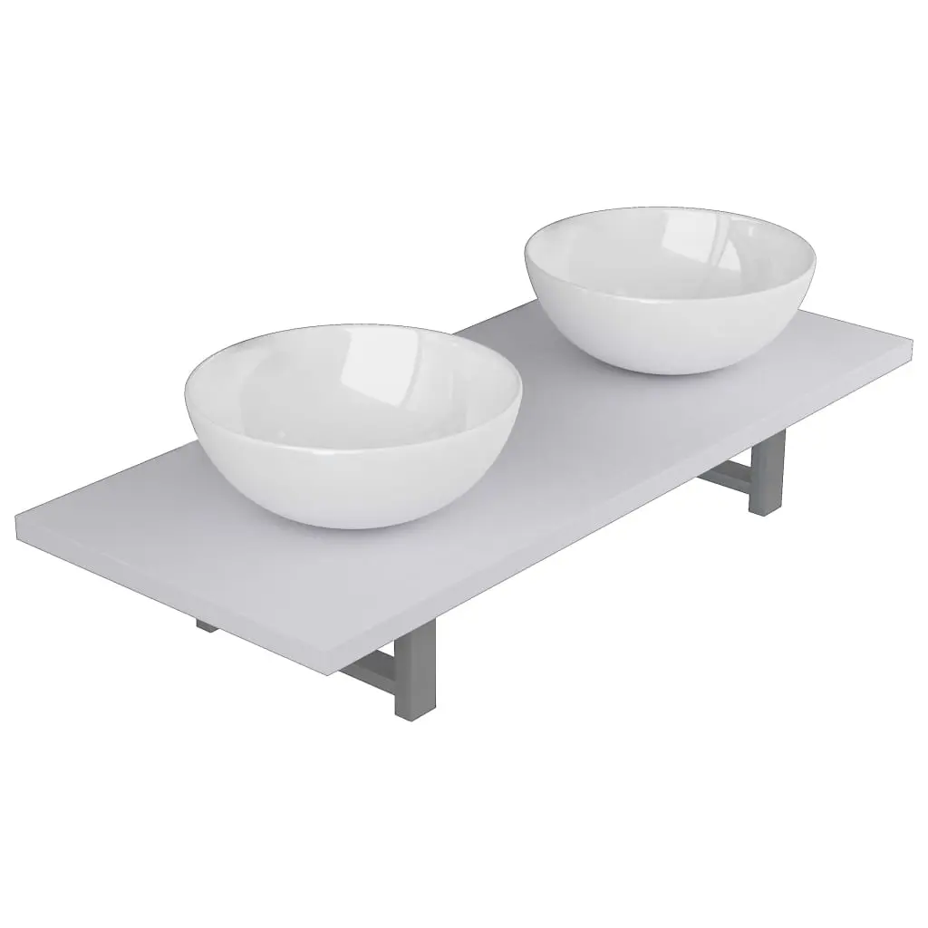 Our practical and timeless bathroom furniture set consists of a wall shelf and two round-shaped basins. It will make a stylish addition to any bathroom, washroom or powder room. Made of the strong material, the bathroom wall shelf is exceedingly stable and durable, making it the perfect place to place the included ceramic basins. This ceramic basins have a high gloss finish and are easy to clean with a damp cloth. In addition, the bathroom furniture can be easily installed on the wall with our included brackets and mounting materials. The perfect combination of the wall shelf and wash basin will be the focal point in your bathroom! Please note that no drain is included in delivery.