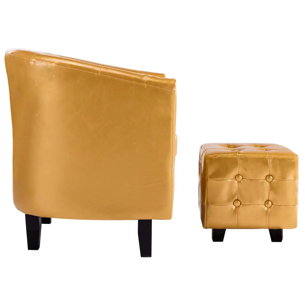 This tub chair and stool set will create an elegant ambiance in all waiting and reception areas, offices and private residential areas. With its tufted and studded detailing and gracefully curved arms, this armchair and footrest set will add a touch of luxury, class and style to any interior. The thickly padded seat is highly comfortable, while the wooden structure is sturdy and durable. The quality artificial leather upholstery is easy to clean and hardwearing. Delivery includes an armchair and a foot stool.