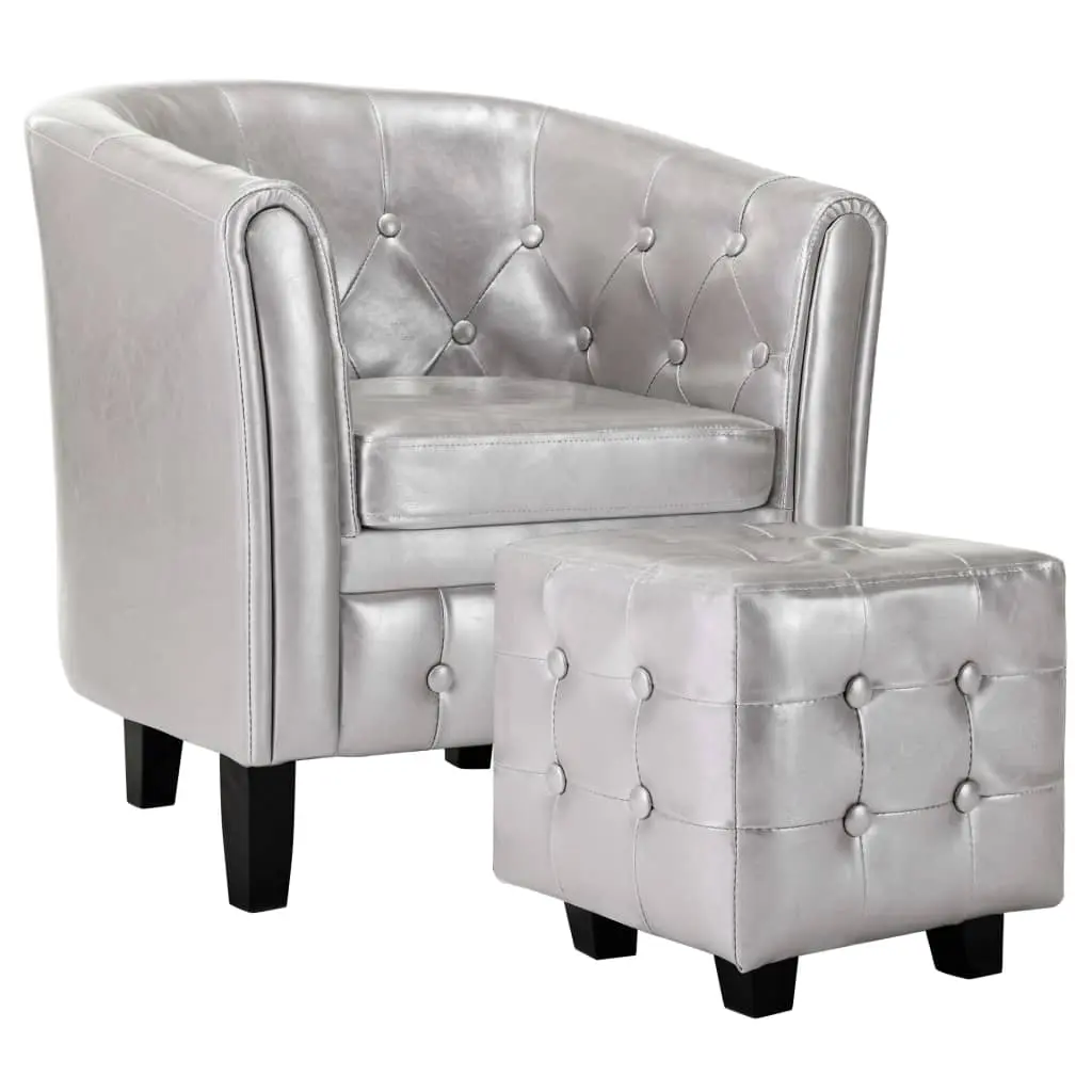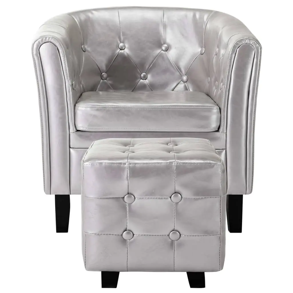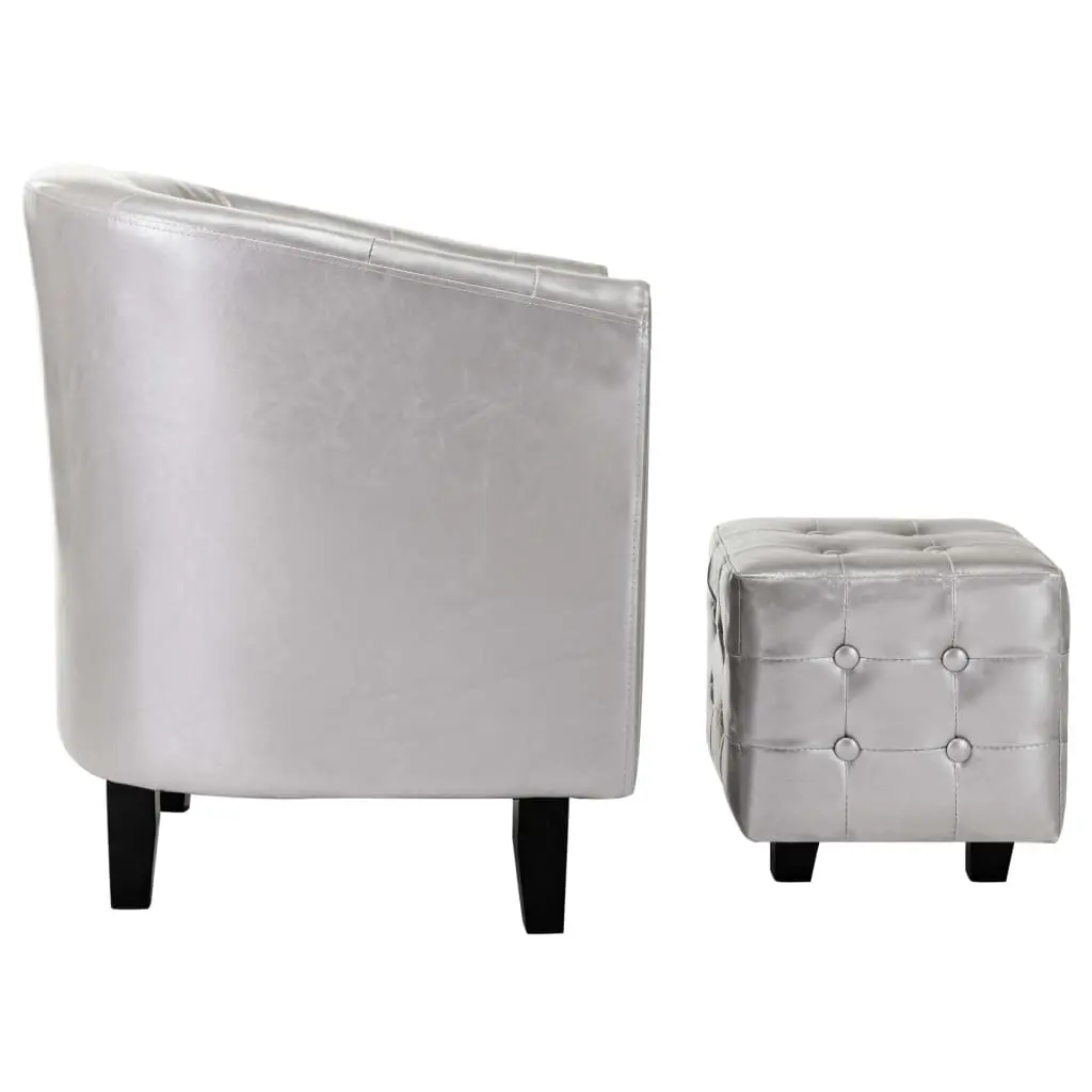 This tub chair and stool set will create an elegant ambiance in all waiting and reception areas, offices and private residential areas. With its tufted and studded detailing and gracefully curved arms, this armchair and footrest set will add a touch of luxury, class and style to any interior. The thickly padded seat is highly comfortable, while the wooden structure is sturdy and durable. The quality artificial leather upholstery is easy to clean and hardwearing. Delivery includes an armchair and a foot stool.