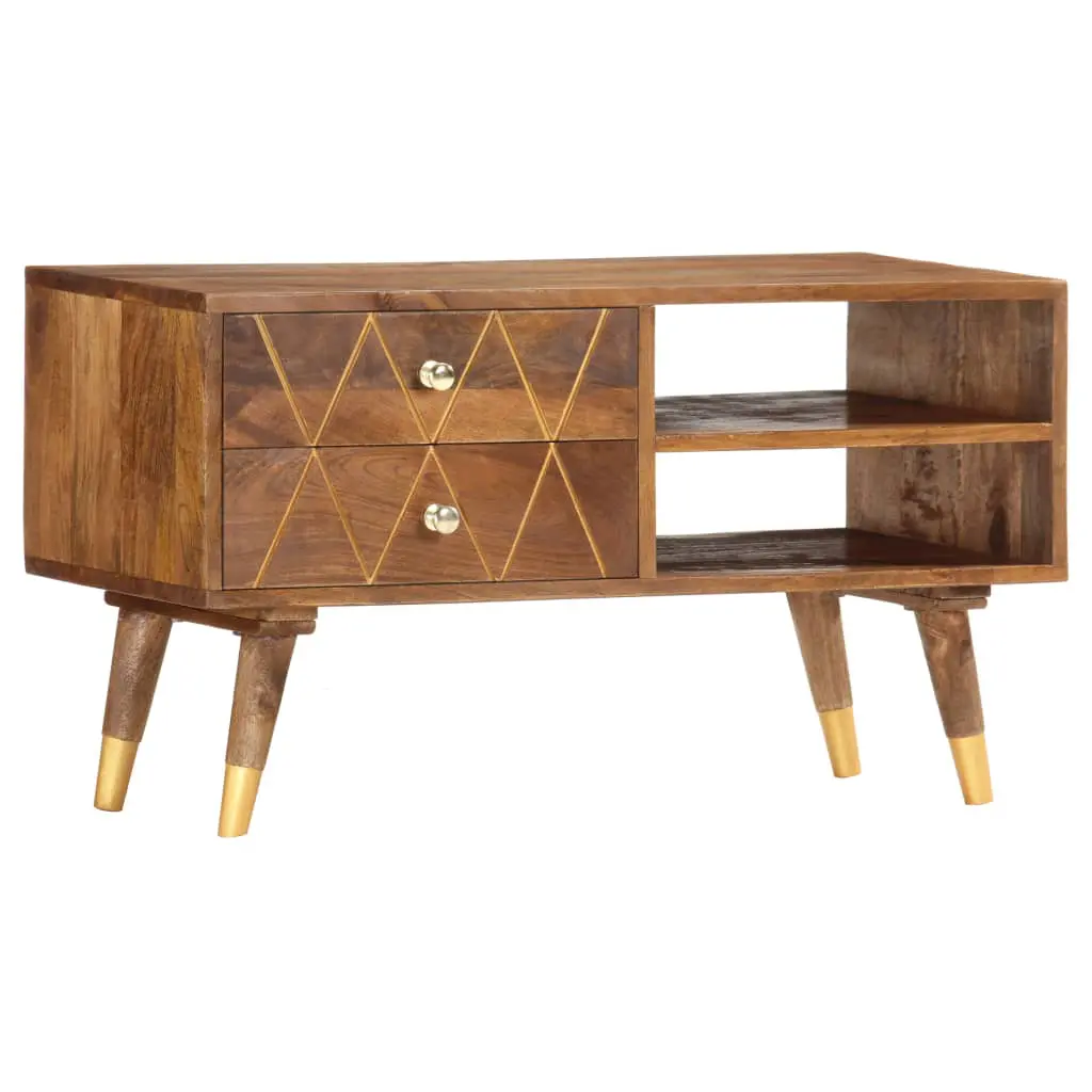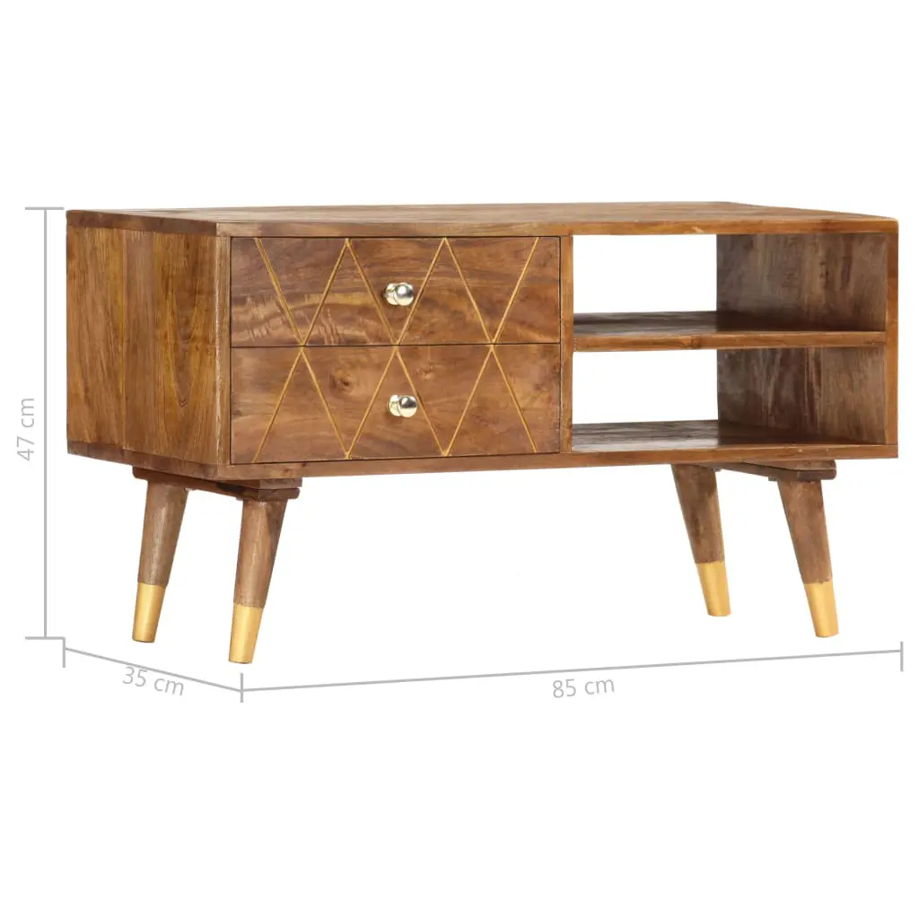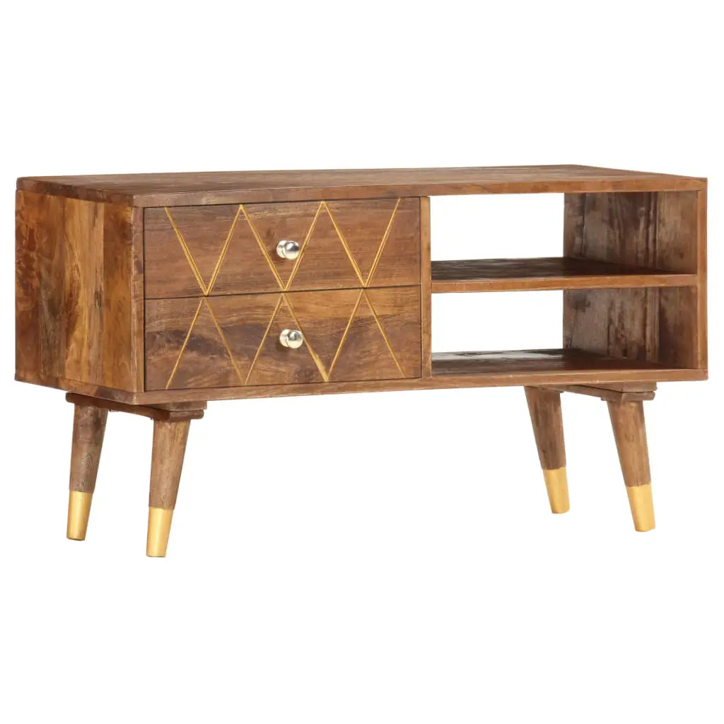 Introduce an air of rustic charm to your interior with our elegant wooden TV cabinet! It will make a timeless addition to your living space. Made of solid mango wood, the TV stand has been given a beautiful finish by polishing and lacquering, making it exude a refined look. Mango wood is a dense and robust hardwood which has beautiful brown or golden streaks and contours on its surface. Additionally, the 2 drawers and 2 open compartments provide storage space for keeping smaller items organised and within reach. Important note: The exquisite craftsmanship and the beautiful solid mango wood grains make every piece of furniture unique and slightly different from the next; the delivery is random. It is easy to assemble.
