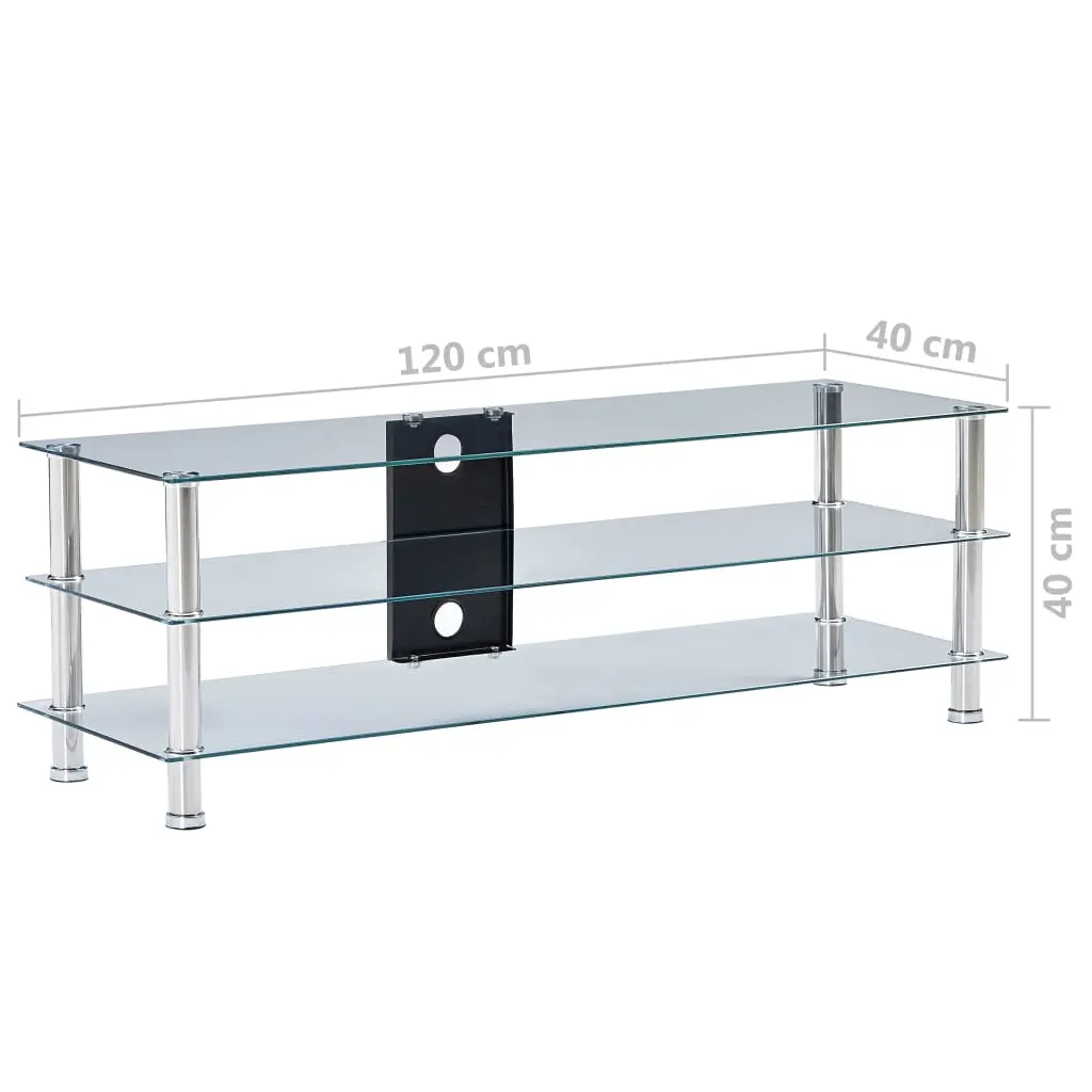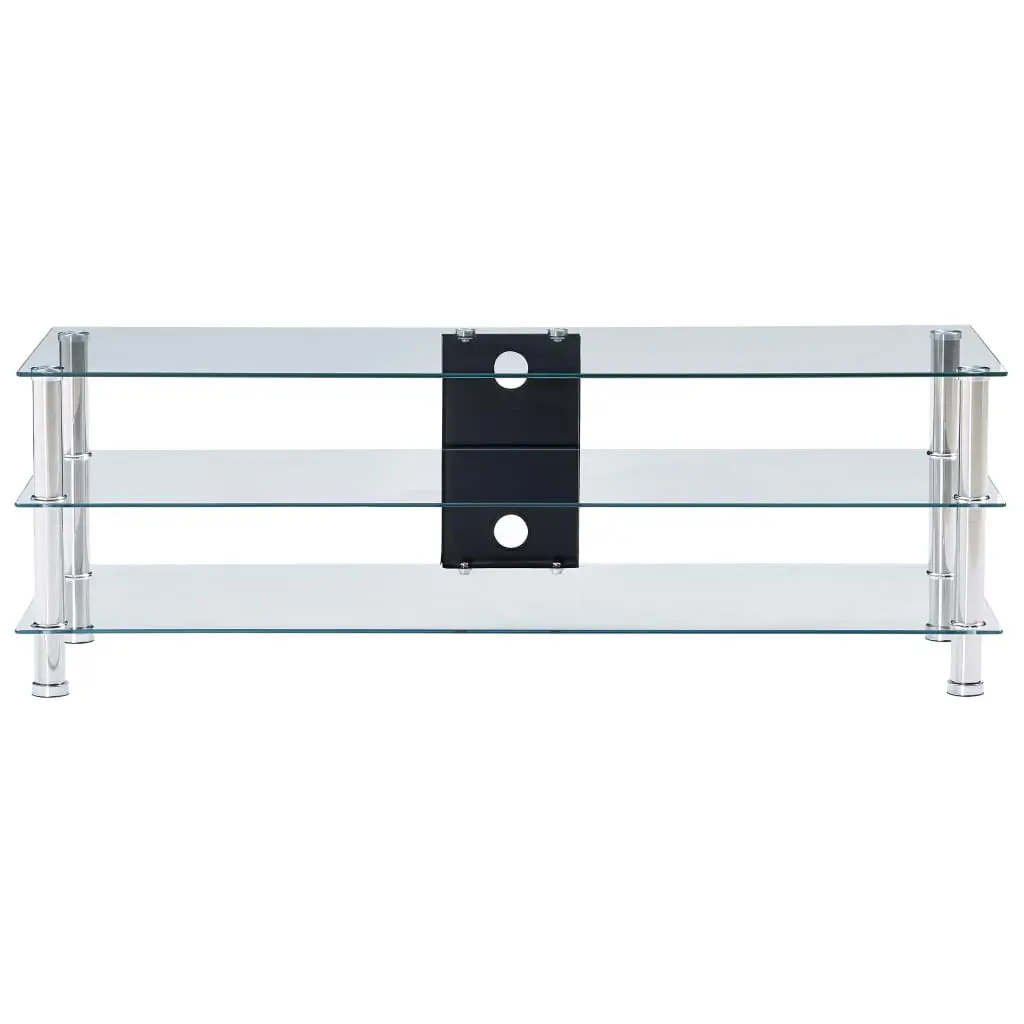 Instantly add a touch of style to your living space with our contemporary and practical glass TV stand! Made of thick tempered glass and heavy-durable stainless steel, this TV table is exceedingly sturdy and safe. The 2 shelves underneath the tabletop can accommodate your DVD player, game console, streaming device, receivers, media carriers, as well as various other items. Thanks to the cable accesses, all the cables will be neatly hidden. Additionally, the smooth surface is easy to clean with only a damp cloth. Our TV shelf is easy to assemble.