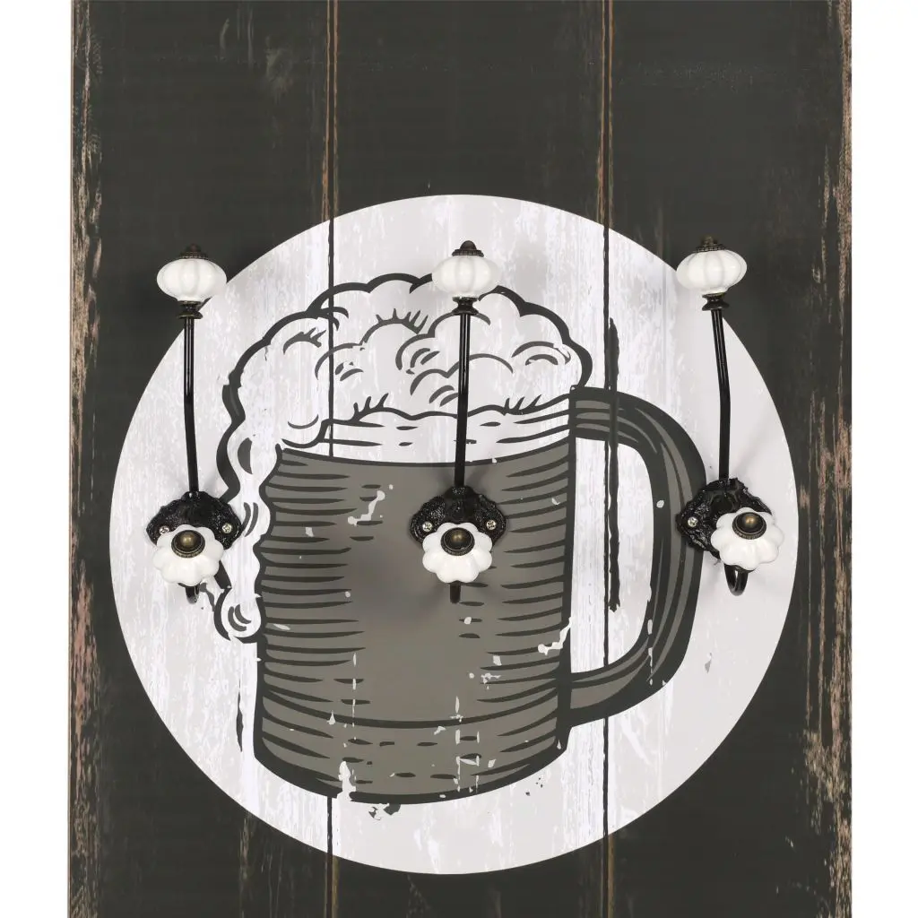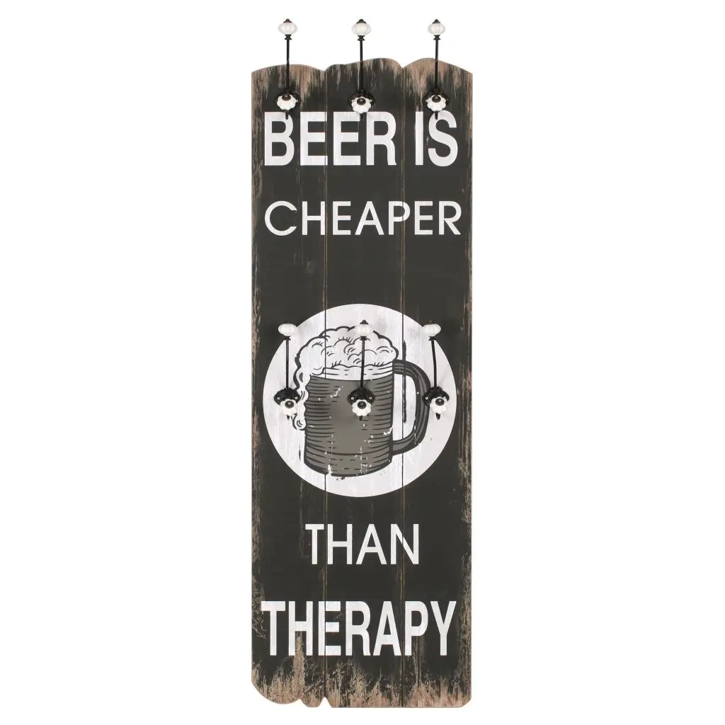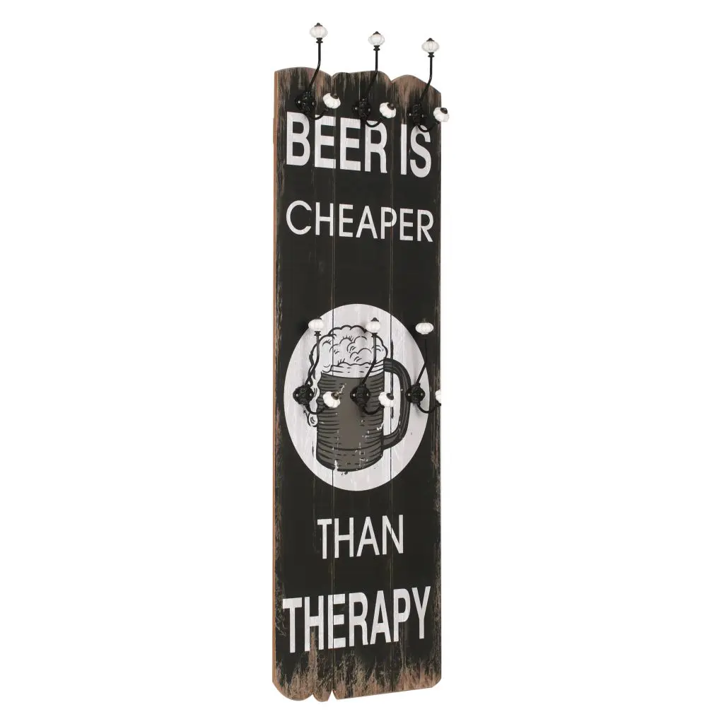 With its vintage-style print reading “Beer is cheaper than therapy”, this wall-mounted coat rack with 6 hooks will become a real eye-catcher that your guests will immediately notice. The coat rack is made of MDF board, which is very sturdy. Designed with two rows of three exquisite metal hooks, the coat rack has ample space for your coats, bags, scarves, hats or other small items. With two attachment points on the back, the coat rack can be easily mounted onto the wall. The assembly is easy. Delivery also includes the required mounting materials.