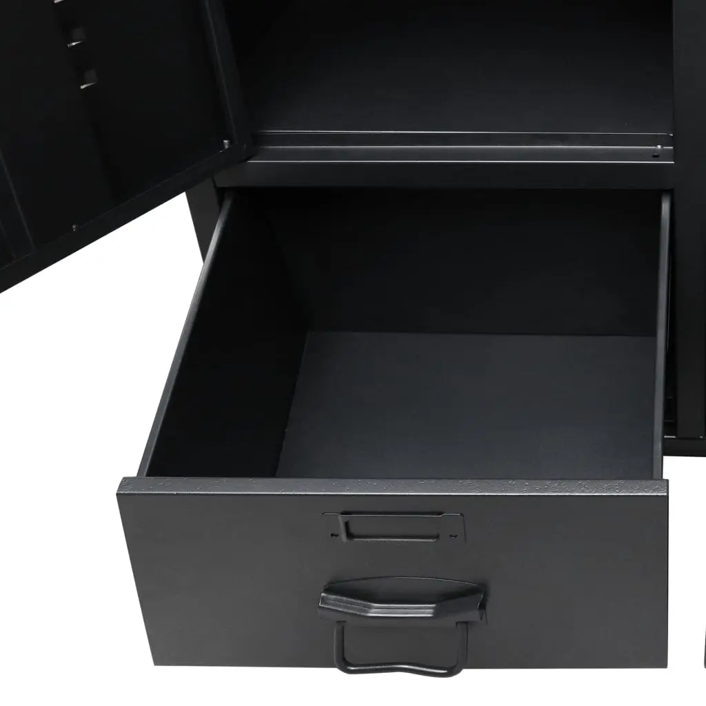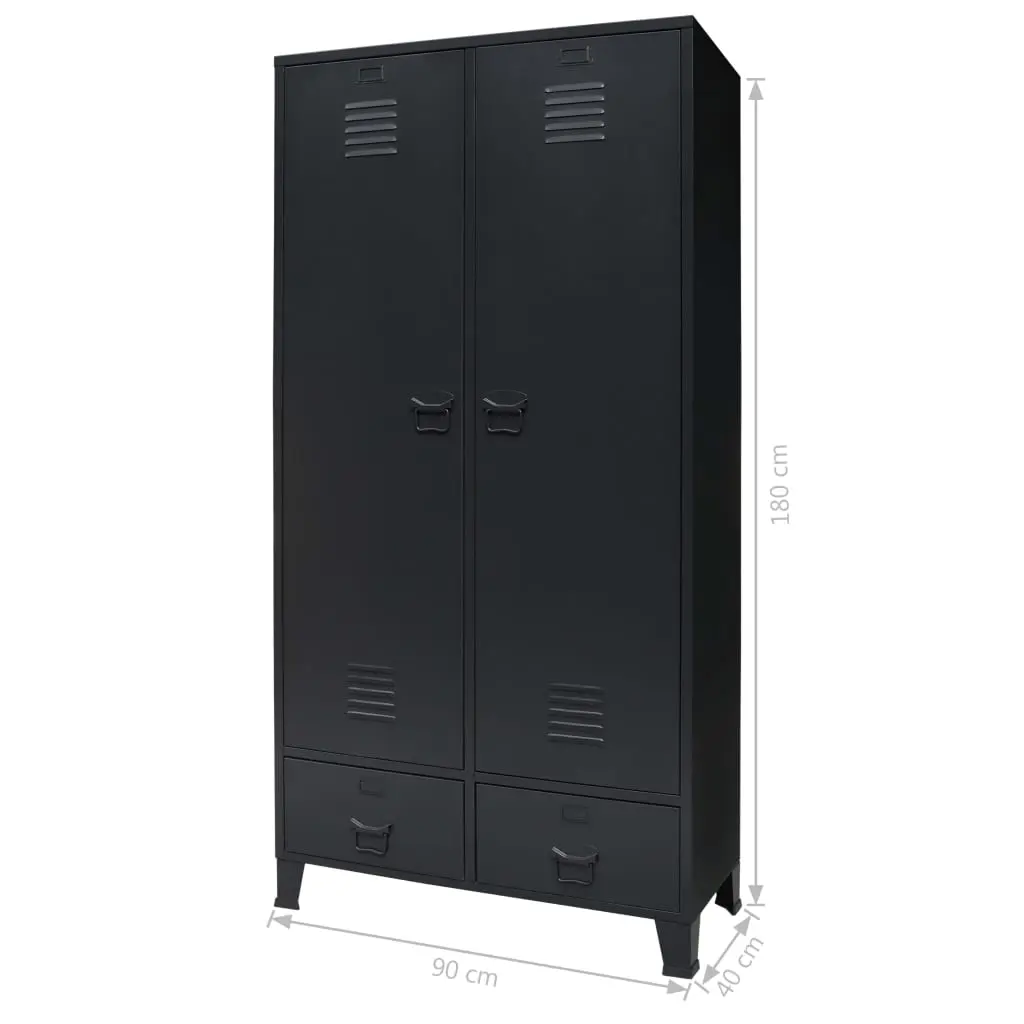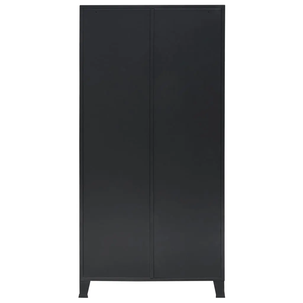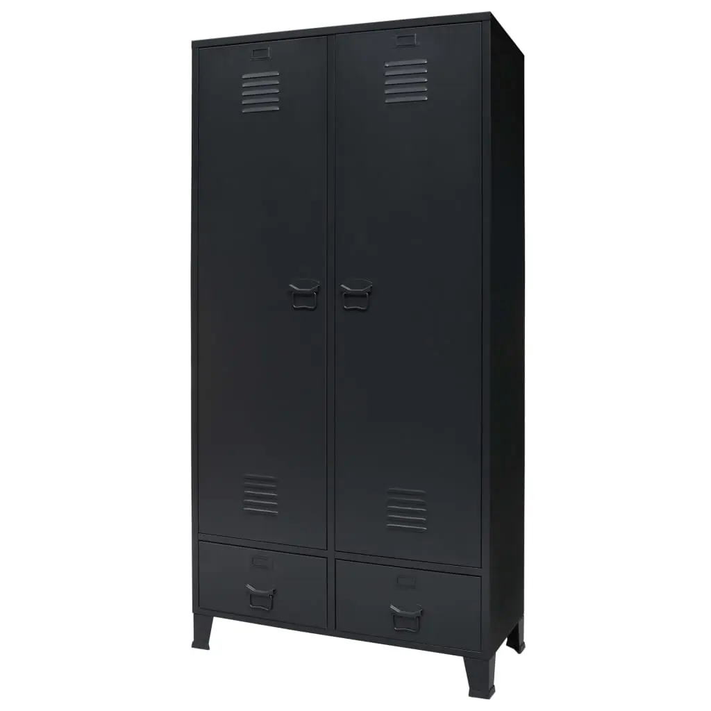 Our practical wardrobe not only presents a perfect storage solution, but also makes a unique decorative addition to your home with its cool, industrial style. The closet has 3 adjustable interior shelves that allow you to neatly sort your clothes into different categories and 2 drawers for storing and organising your socks, underclothes, etc. The garderobe is equipped with 1 hanging bar, and each door has a name card holder and ventilation holes to add to its industrial look. This storage cabinet is made of sheet metal, which makes it durable and easy to clean. Assembly is easy.