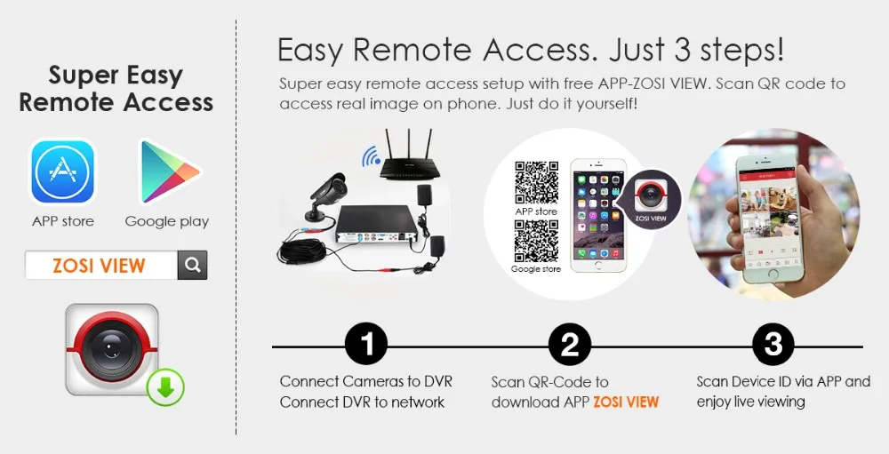 The free ZOSI VIEW app lets you see all of your cameras in one place. Check in on your home or business wherever you have an internet connection. Free ZOSI VIEW App for Live View & Playback on Smart Devices with WiFi or 2G/3G/4G Anywhere Anytime. Smart Phone Support: iPhone, Android ,Ipad.