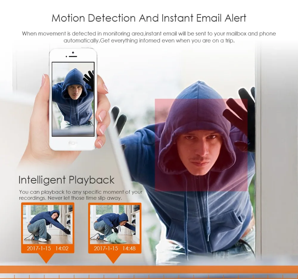 Be notified when there are unexpected movements. Smart notifications with image will be pushed to your smartphone via iPhone/Android App. And you won’t miss any moment with remote and local playback.